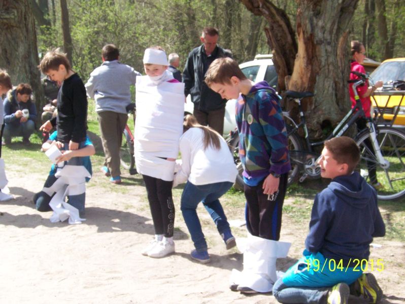Na mecie w Żarnowcu przy Źródełku, czekała na wszystkich wspaniała grochówka i chleb ze smalcem. Organizatorzy przygotowali wiele konkursów i zabaw, między innymi rzuty do celu, skoki w workach czy robienie mumii.