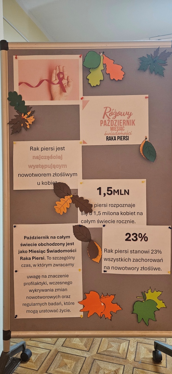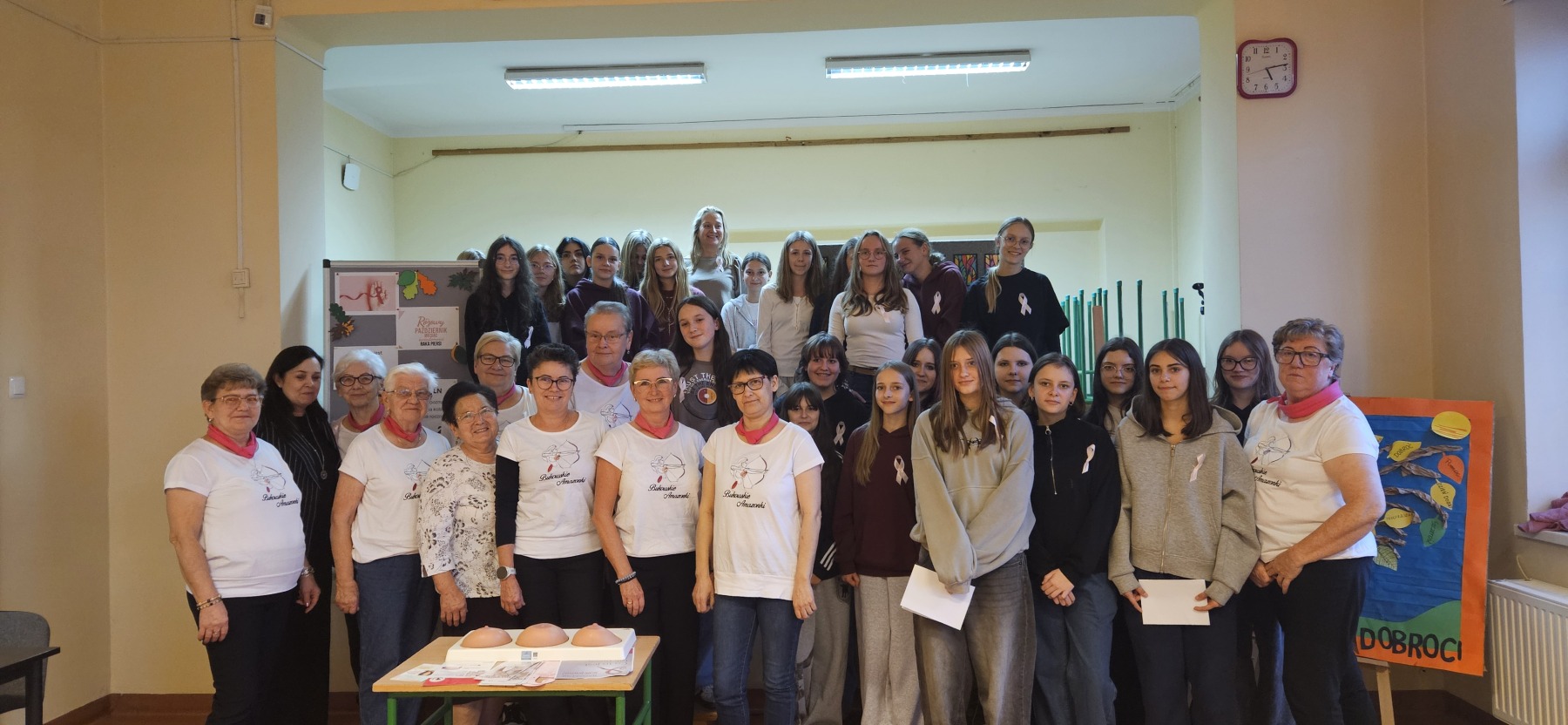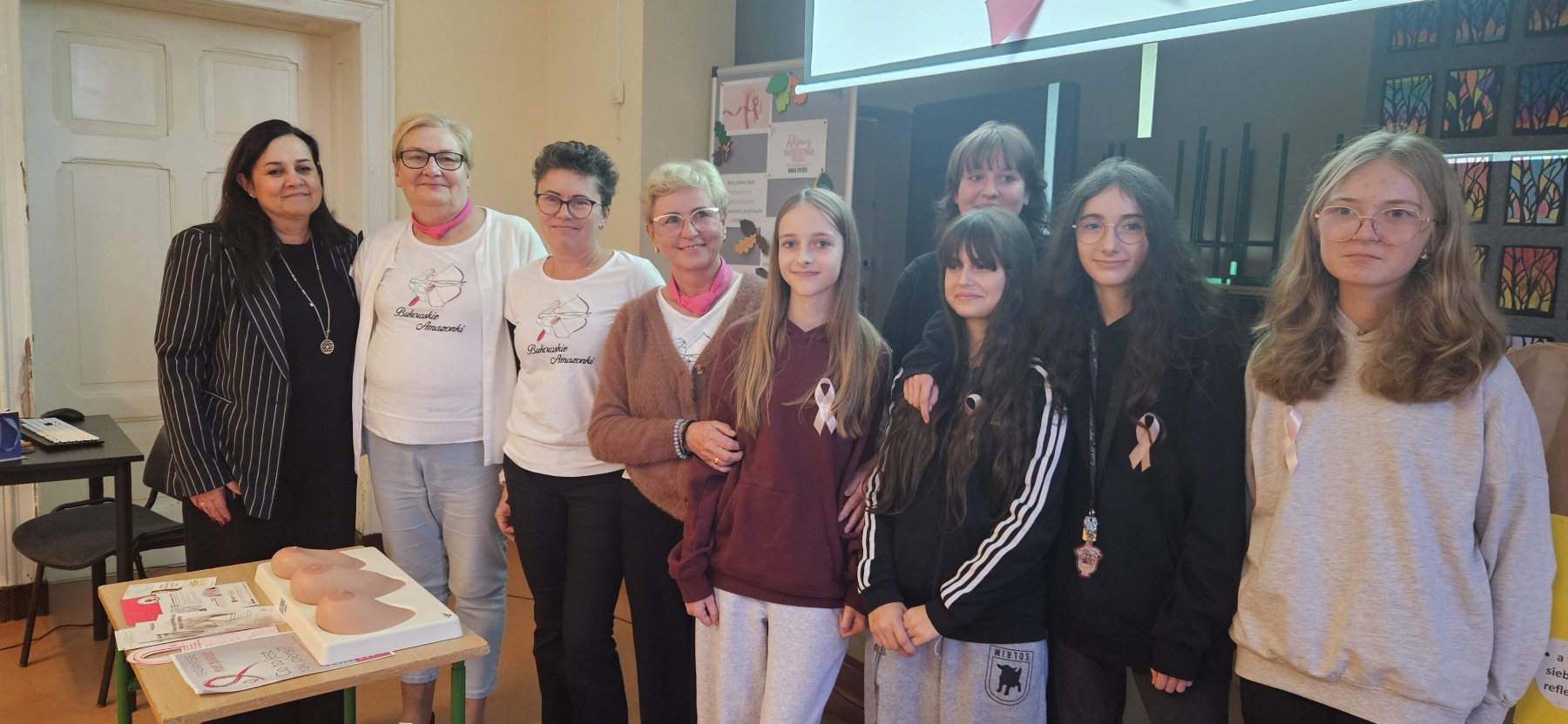 W dniu 4 listopada odbyło się spotkanie uczennic klas VII i VIII z przedstawicielkami stowarzyszenia Amazonek. Celem spotkania było przybliżenie tematyki profilaktyki raka piersi oraz zwrócenie uwagi na znaczenie dbania o zdrowie i regularnych badań. Podczas prelekcji Amazonki opowiedziały o swoich doświadczeniach w walce z chorobą, omówiły metody jej wczesnego wykrywania oraz znaczenie samobadania piersi. Uczennice miały okazję zadać pytania i dowiedzieć się, jak dbać o zdrowy styl życia. Każda z dziewcząt miała okazję zbadać na fantomie zdrową pierś oraz z guzem.