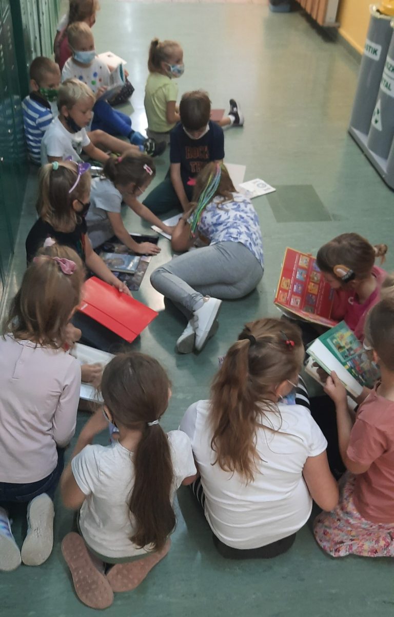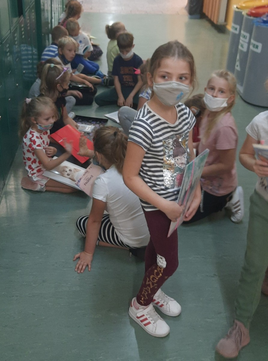 Spotkanie z książką może być fascynującą przygodą lub obowiązkiem. Z zaproszeniem do szkolnej biblioteki przyszła pani Iza Wrzyszcz -Starosta, która opiekuje się klasą 1b w bibliotece. Przeczytała fragment „Plastusiowego pamiętnika” i zaprosiła do swojego królestwa. Mimo restrykcyjnych zasad sanitarnych związanych z COVID –19 pani Iza dba, by dzieci wyszły z biblioteki z książką, która je zaciekawi. Czasem daje nura między półki z książkami w poszukiwaniu egzemplarza na zamówienie. Dzieci nie mogły się doczekać, by przerzucić choć kilka kart ze swojej książki.
