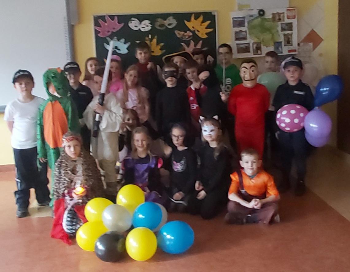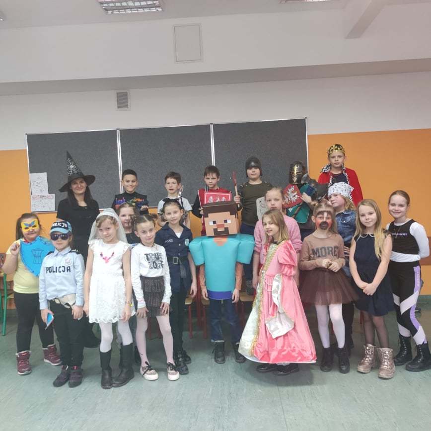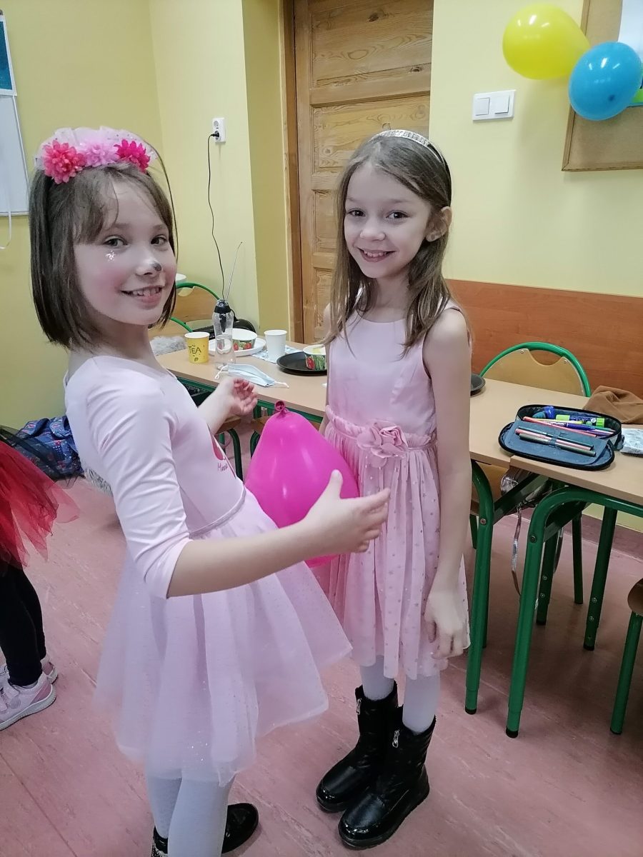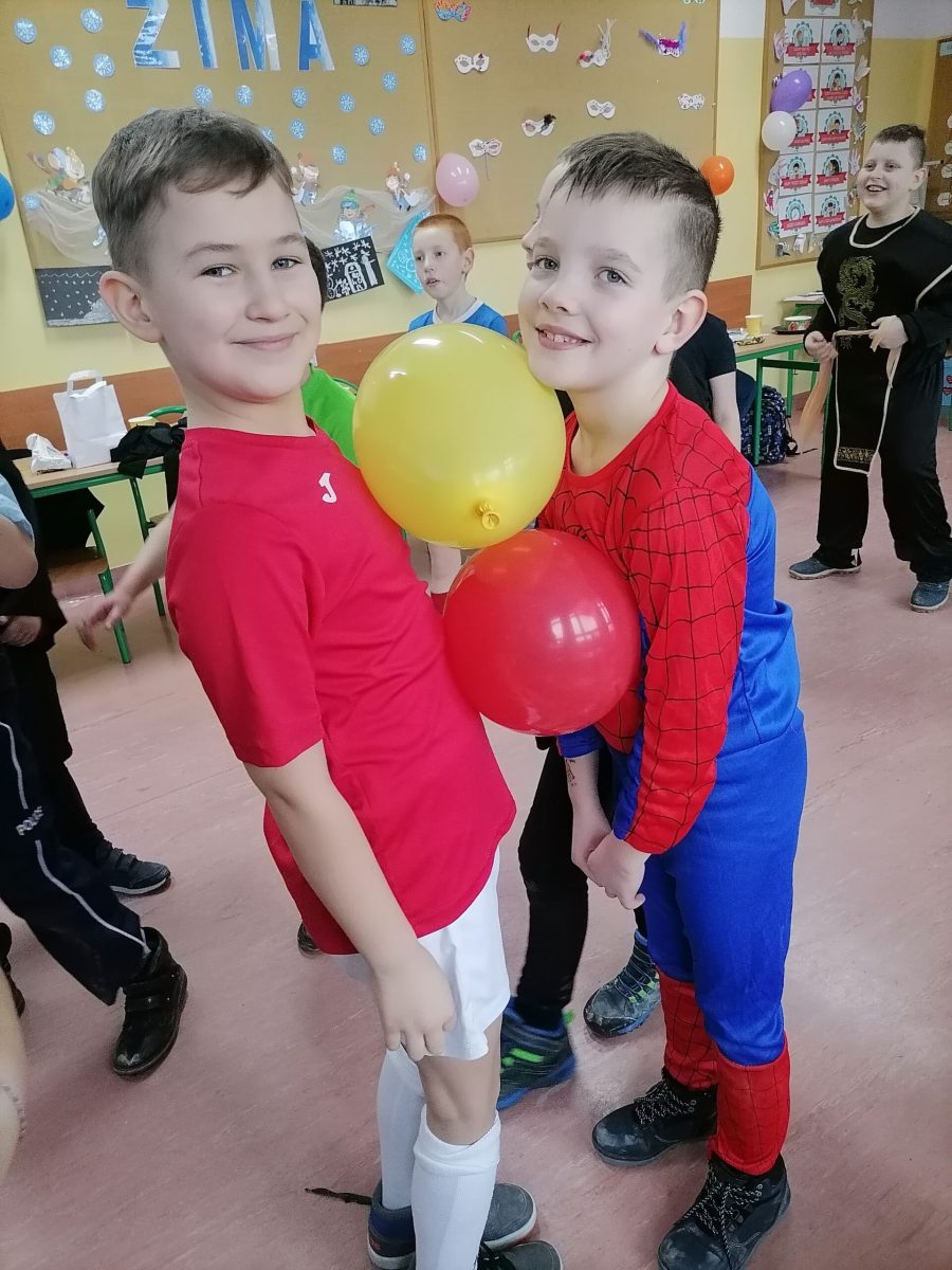 „W piątek, 11 lutego, w naszej sali numer 1 odbył się balik karnawałowy. Wzięli w nim udział uczniowie klasy 3a z panią Siekierską. Najpierw przygotowaliśmy salę do zabaw: przestawiliśmy ławki i krzesła, udekorowaliśmy ją balonami. Na stołach rozłożyliśmy poczęstunek: babeczki, ciastka, chrupki. Następnie przebraliśmy się w kostiumy. Kilka dziewczyn było księżniczkami. Pojawiły się postacie z „Gwiezdnych Wojen”. Ja miałem strój wojskowego, bo interesuję się militariami. Potem tańczyliśmy i bawiliśmy się. Na koniec posprzątaliśmy salę. Bardzo podobał mi się nasz klasowy balik. Mam nadzieję, że w przyszłości będę uczestniczył w podobnej imprezie. Było miło i długo tego nie zapomnę.”