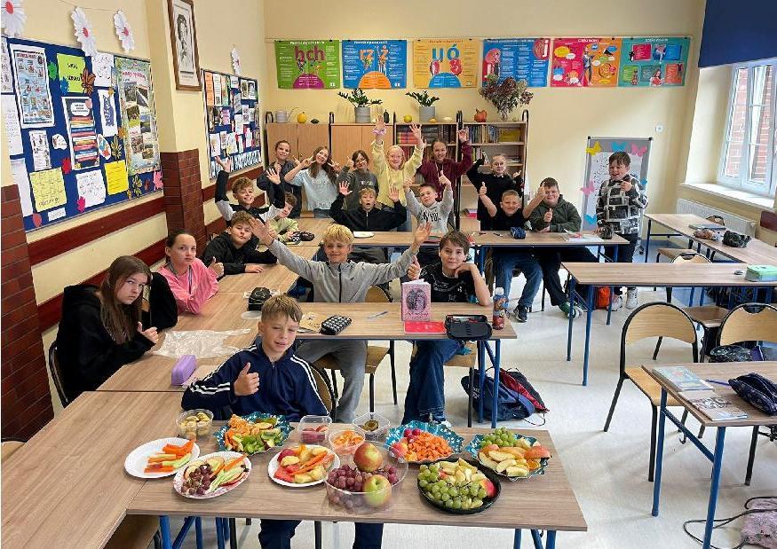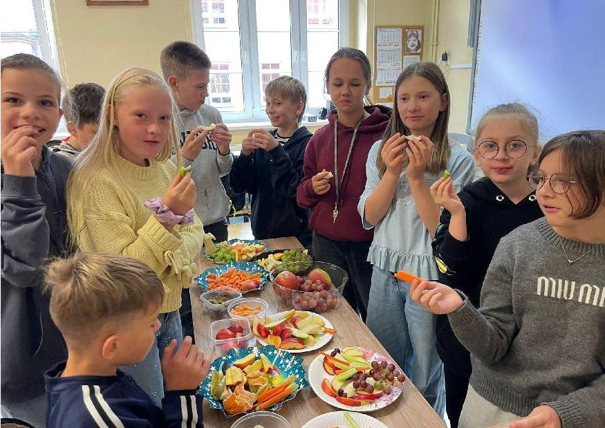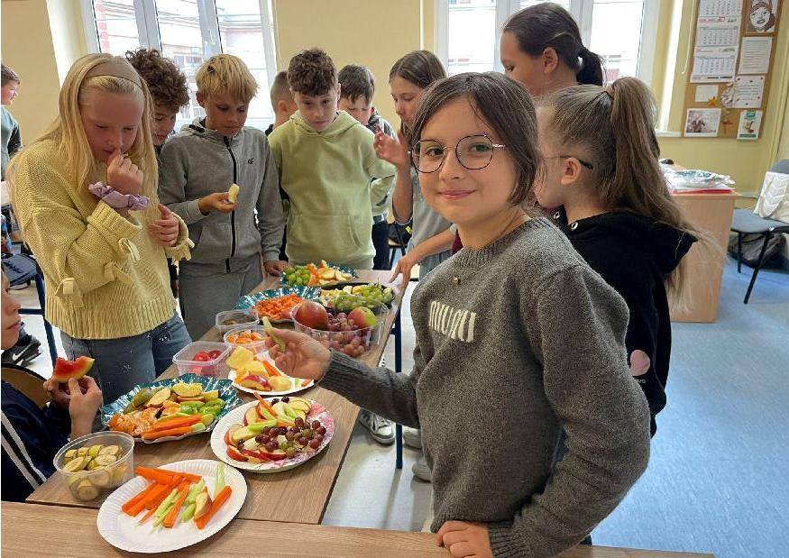 Miniony tydzień upłynął pod hasłem „Smacznie, zdrowo, kolorowo”. Podczas przerw w obu budynkach uczniowie częstowali się świeżymi warzywami i owocami, które wypełniły stoły kolorami i zapachami natury. Na zajęciach rozmawiano o znaczeniu zdrowego odżywiania oraz o tym, jak ważne jest włączanie witamin do codziennej diety. Serdecznie dziękujemy rodzicom za przygotowanie smakowitych przekąsek, nauczycielom i pracownikom obsługi za pomoc w organizacji zdrowych przerw, a przede wszystkim dzieciom – za ich zaangażowanie i przyniesienie witaminowych darów. To dzięki Wam nasza akcja była tak barwna i pełna pozytywnej energii! Zespół Szkoły Promującej Zdrowie