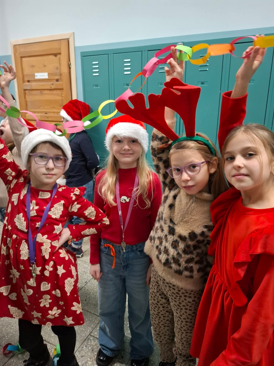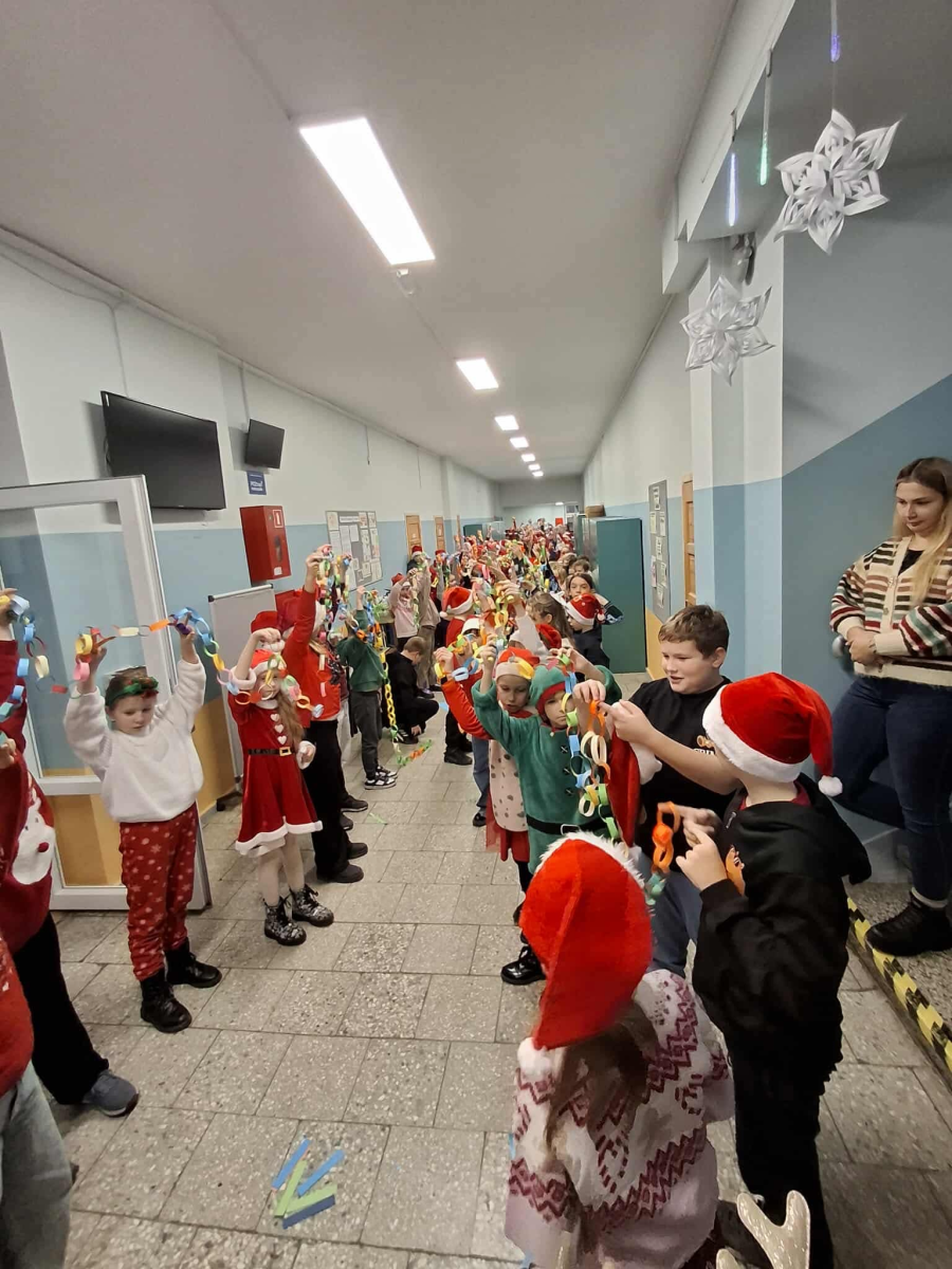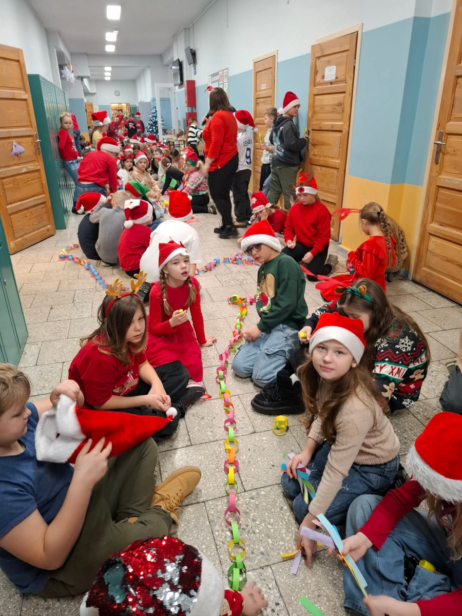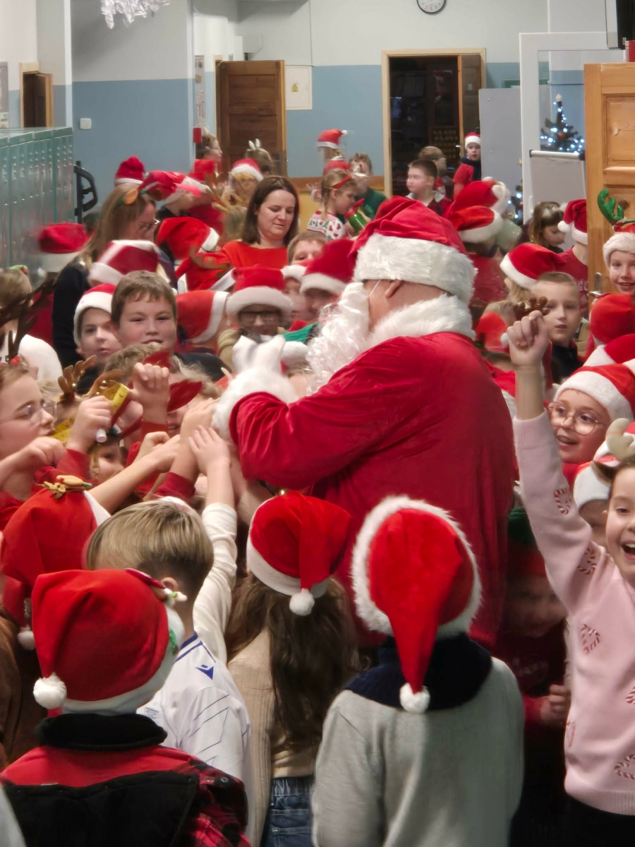 Szósty grudnia to data wyjątkowa i długo wyczekiwana zarówno przez dzieci, jak i dorosłych. Mikołajki na stałe wpisały się w kalendarz, dlatego także w tym roku nie zabrakło wspólnej zabawy, uśmiechów i świątecznej atmosfery. W klasach 1–3 uczniowie wzięli udział w integracyjnym tworzeniu najdłuższego świątecznego łańcucha, który później ozdobił korytarz szkoły, wprowadzając wszystkich w bożonarodzeniowy nastrój. Tego dnia szkolne sale i korytarze mieniły się czerwienią, bielą i złotem — uczniowie przyszli ubrani w stroje z akcentem mikołajkowym, co dodatkowo podkreśliło wyjątkowy charakter święta. Nie zabrakło również najważniejszego gościa – Świętego Mikołaja, który wraz z Paniami Mikołajowymi z Rady Rodziców odwiedzał uczniów i obdarowywał ich słodkimi upominkami. Wszędzie słychać było śmiech, radosne okrzyki i dźwięki świątecznej muzyki, przy której odbywały się wspólne zabawy. To był dzień pełen uśmiechu, integracji i wspólnego przeżywania wyjątkowego czasu, który z pewnością na długo pozostanie w pamięci naszych uczniów.