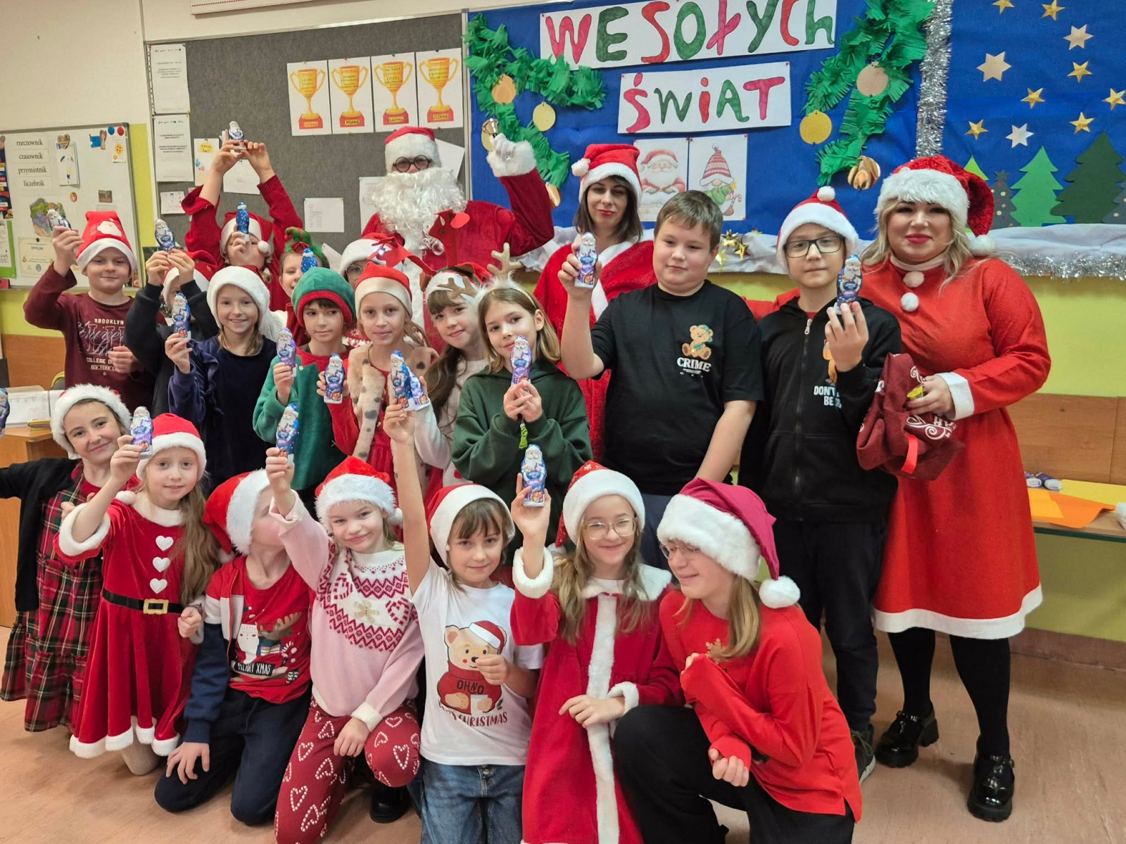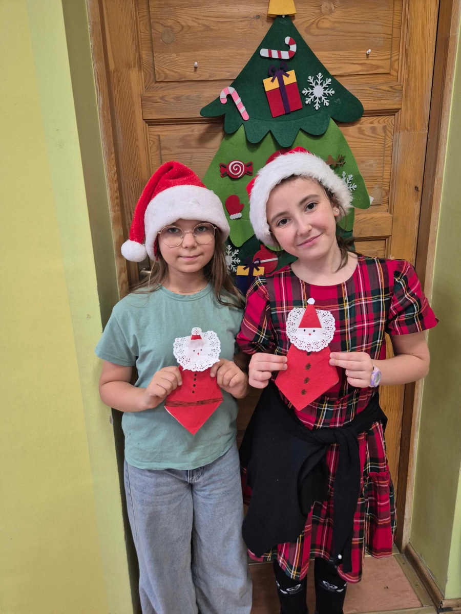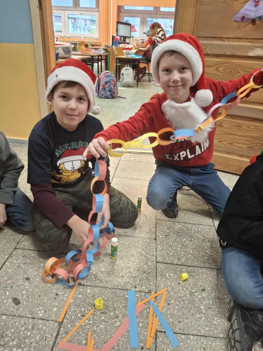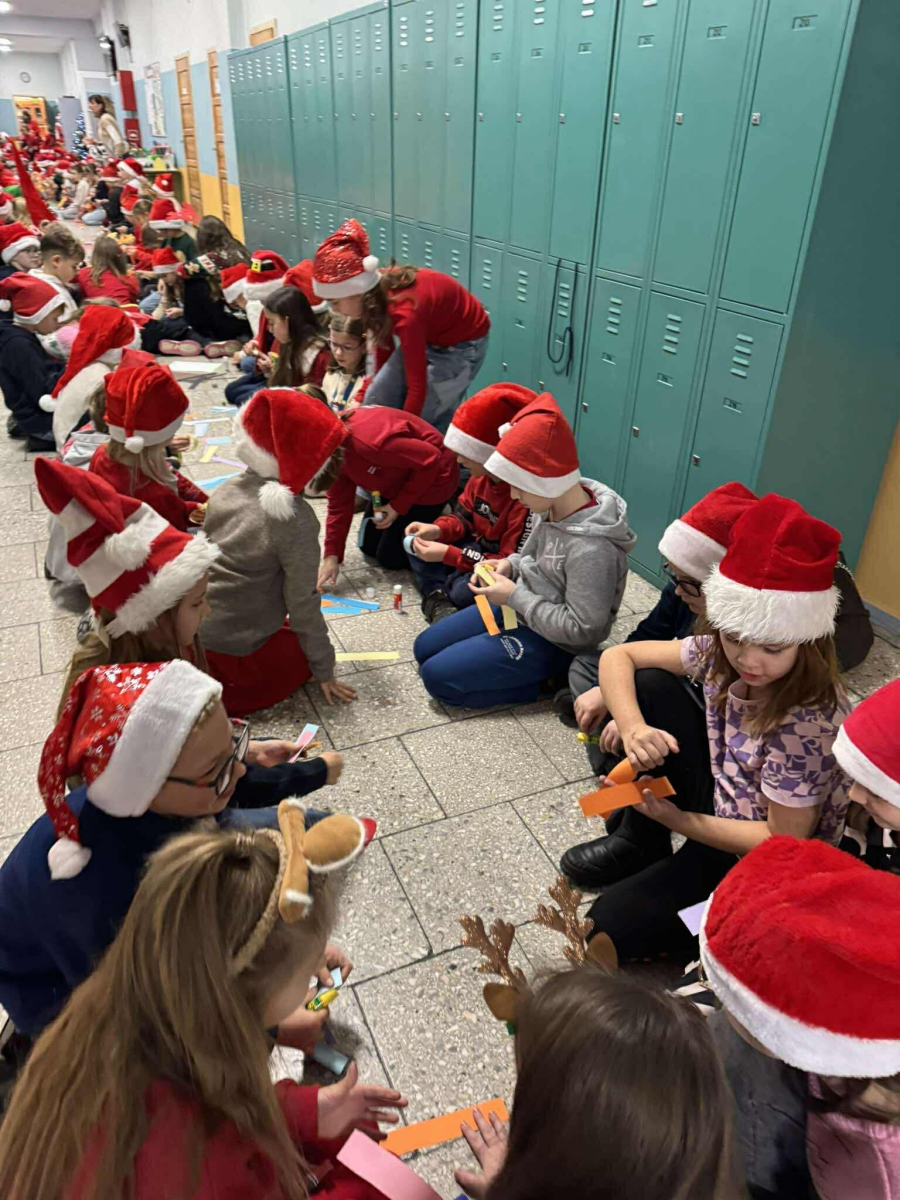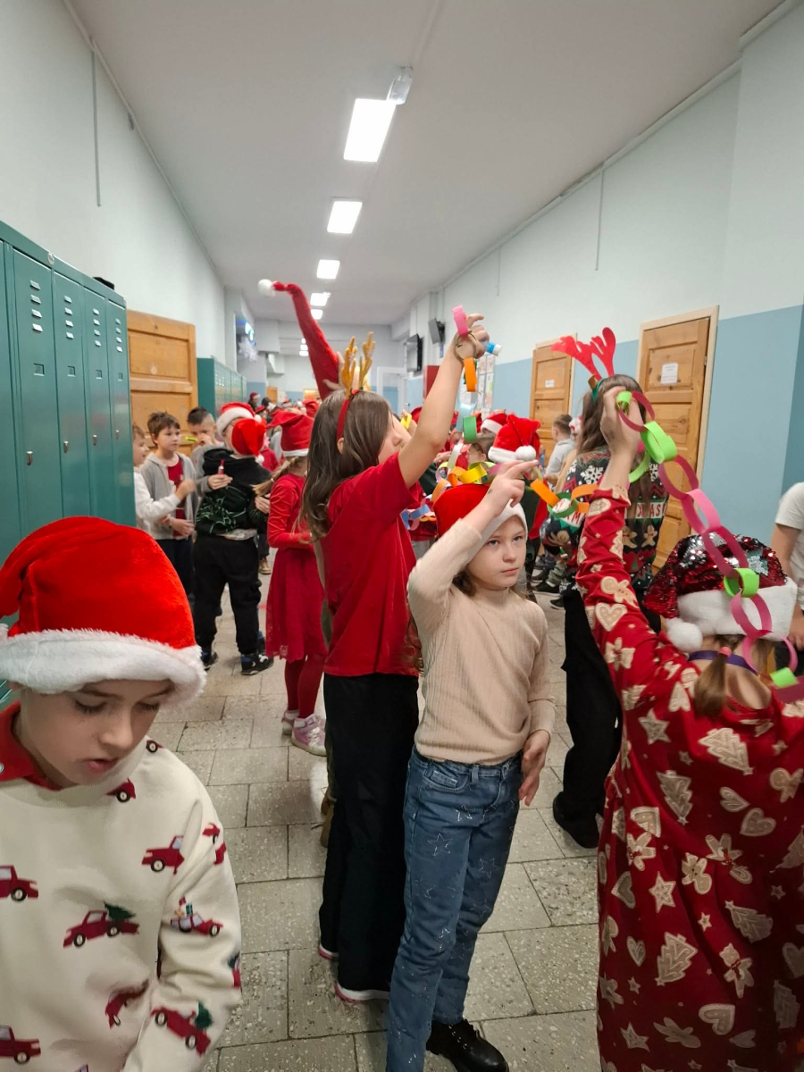 Szósty grudnia to data wyjątkowa i długo wyczekiwana zarówno przez dzieci, jak i dorosłych. Mikołajki na stałe wpisały się w kalendarz, dlatego także w tym roku nie zabrakło wspólnej zabawy, uśmiechów i świątecznej atmosfery. W klasach 1–3 uczniowie wzięli udział w integracyjnym tworzeniu najdłuższego świątecznego łańcucha, który później ozdobił korytarz szkoły, wprowadzając wszystkich w bożonarodzeniowy nastrój. Tego dnia szkolne sale i korytarze mieniły się czerwienią, bielą i złotem — uczniowie przyszli ubrani w stroje z akcentem mikołajkowym, co dodatkowo podkreśliło wyjątkowy charakter święta. Nie zabrakło również najważniejszego gościa – Świętego Mikołaja, który wraz z Paniami Mikołajowymi z Rady Rodziców odwiedzał uczniów i obdarowywał ich słodkimi upominkami. Wszędzie słychać było śmiech, radosne okrzyki i dźwięki świątecznej muzyki, przy której odbywały się wspólne zabawy. To był dzień pełen uśmiechu, integracji i wspólnego przeżywania wyjątkowego czasu, który z pewnością na długo pozostanie w pamięci naszych uczniów.