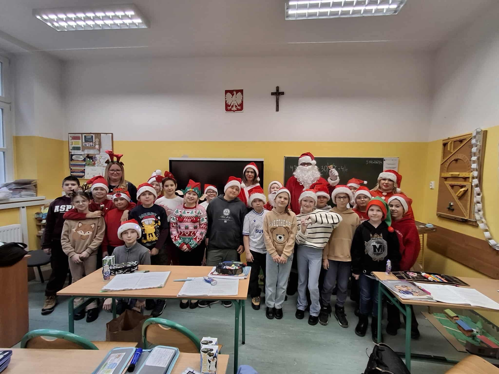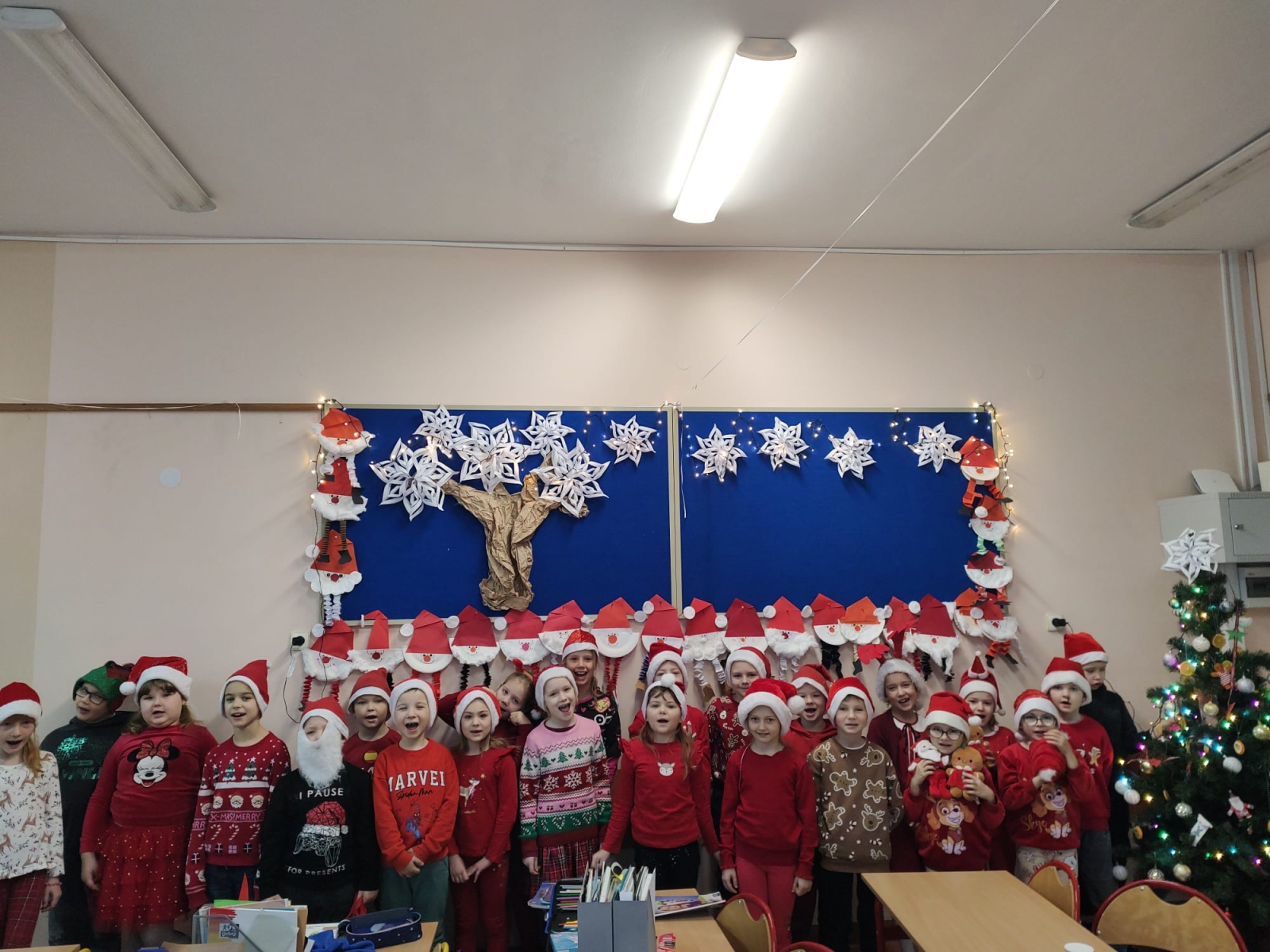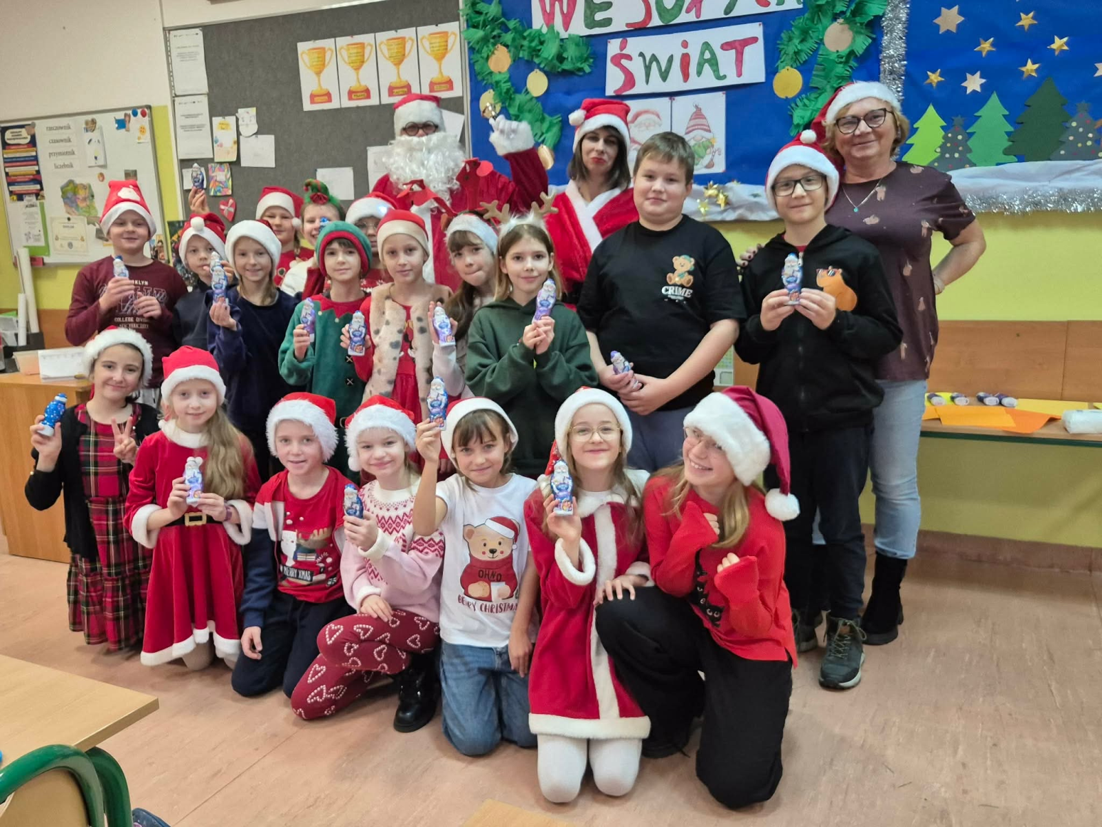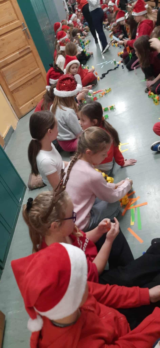 Szósty grudnia to data wyjątkowa i długo wyczekiwana zarówno przez dzieci, jak i dorosłych. Mikołajki na stałe wpisały się w kalendarz, dlatego także w tym roku nie zabrakło wspólnej zabawy, uśmiechów i świątecznej atmosfery. W klasach 1–3 uczniowie wzięli udział w integracyjnym tworzeniu najdłuższego świątecznego łańcucha, który później ozdobił korytarz szkoły, wprowadzając wszystkich w bożonarodzeniowy nastrój. Tego dnia szkolne sale i korytarze mieniły się czerwienią, bielą i złotem — uczniowie przyszli ubrani w stroje z akcentem mikołajkowym, co dodatkowo podkreśliło wyjątkowy charakter święta. Nie zabrakło również najważniejszego gościa – Świętego Mikołaja, który wraz z Paniami Mikołajowymi z Rady Rodziców odwiedzał uczniów i obdarowywał ich słodkimi upominkami. Wszędzie słychać było śmiech, radosne okrzyki i dźwięki świątecznej muzyki, przy której odbywały się wspólne zabawy. To był dzień pełen uśmiechu, integracji i wspólnego przeżywania wyjątkowego czasu, który z pewnością na długo pozostanie w pamięci naszych uczniów.