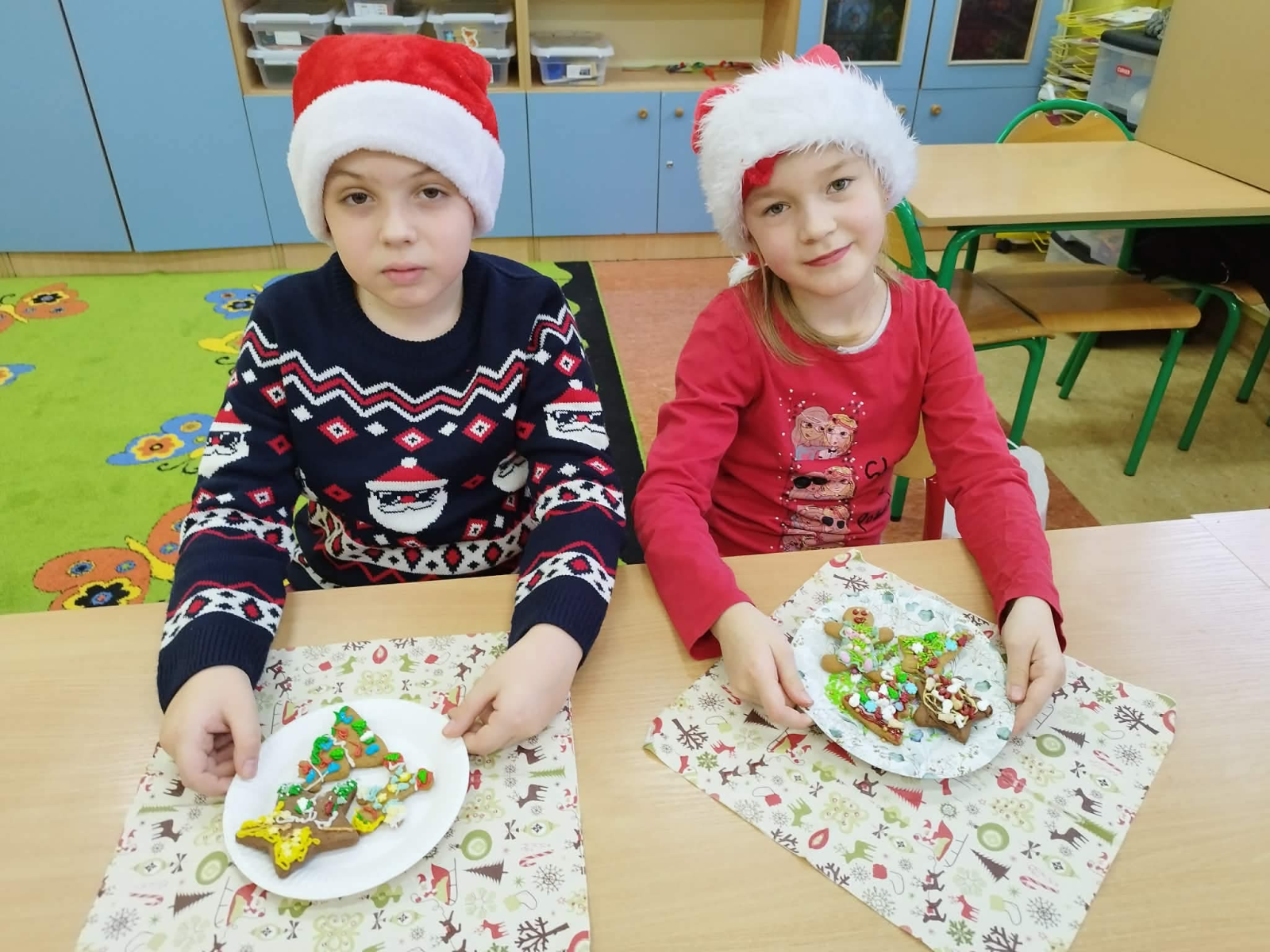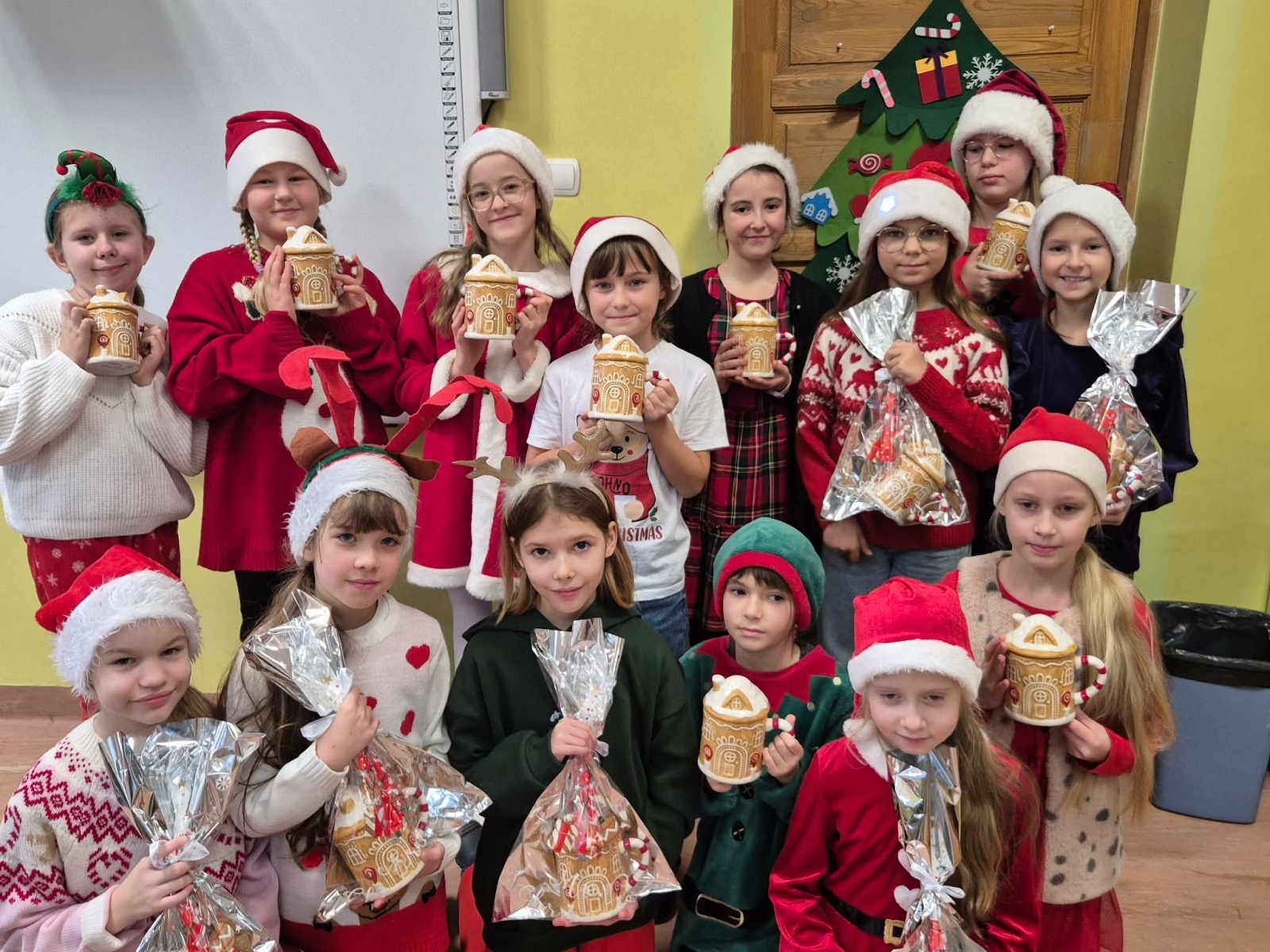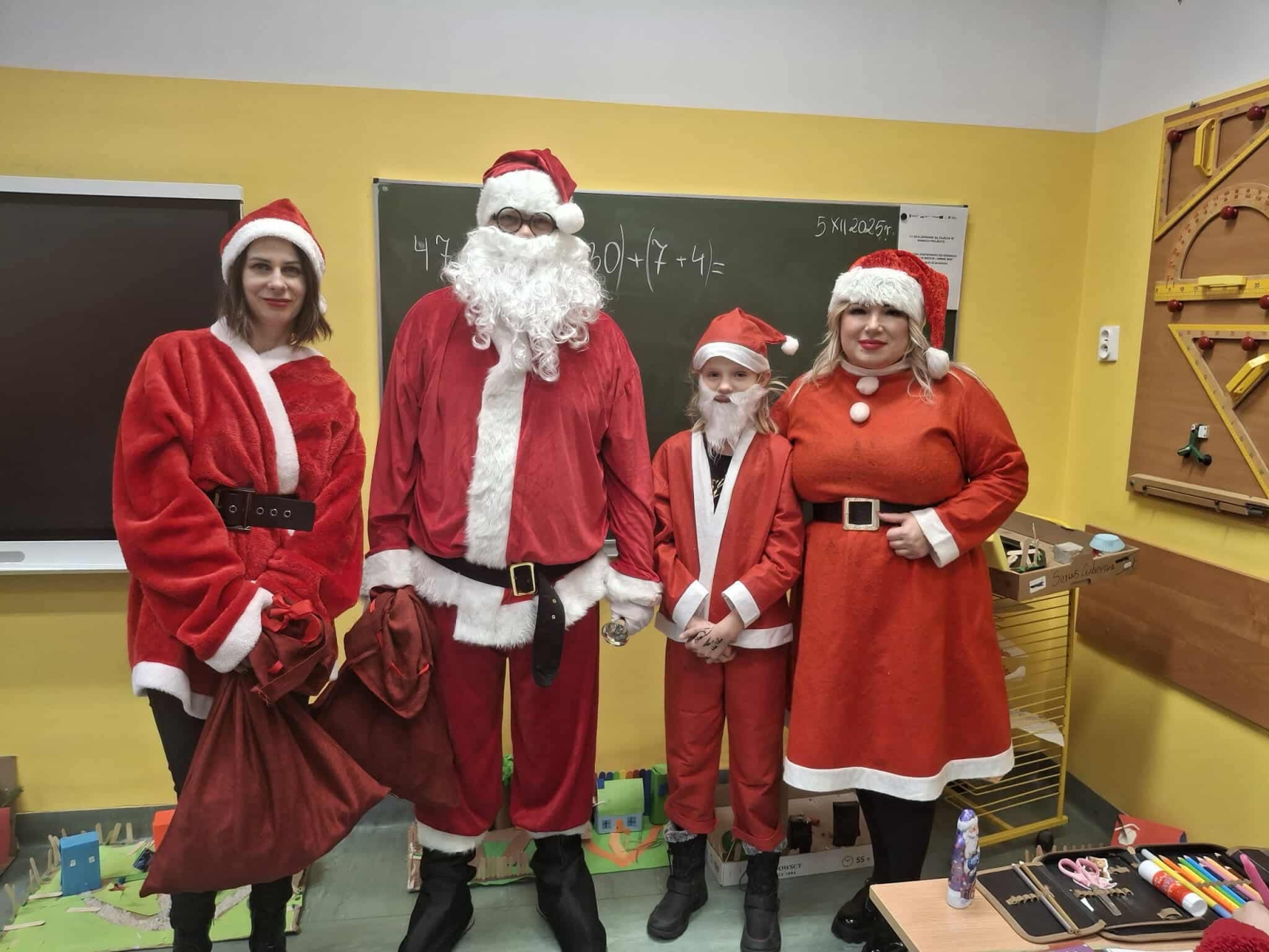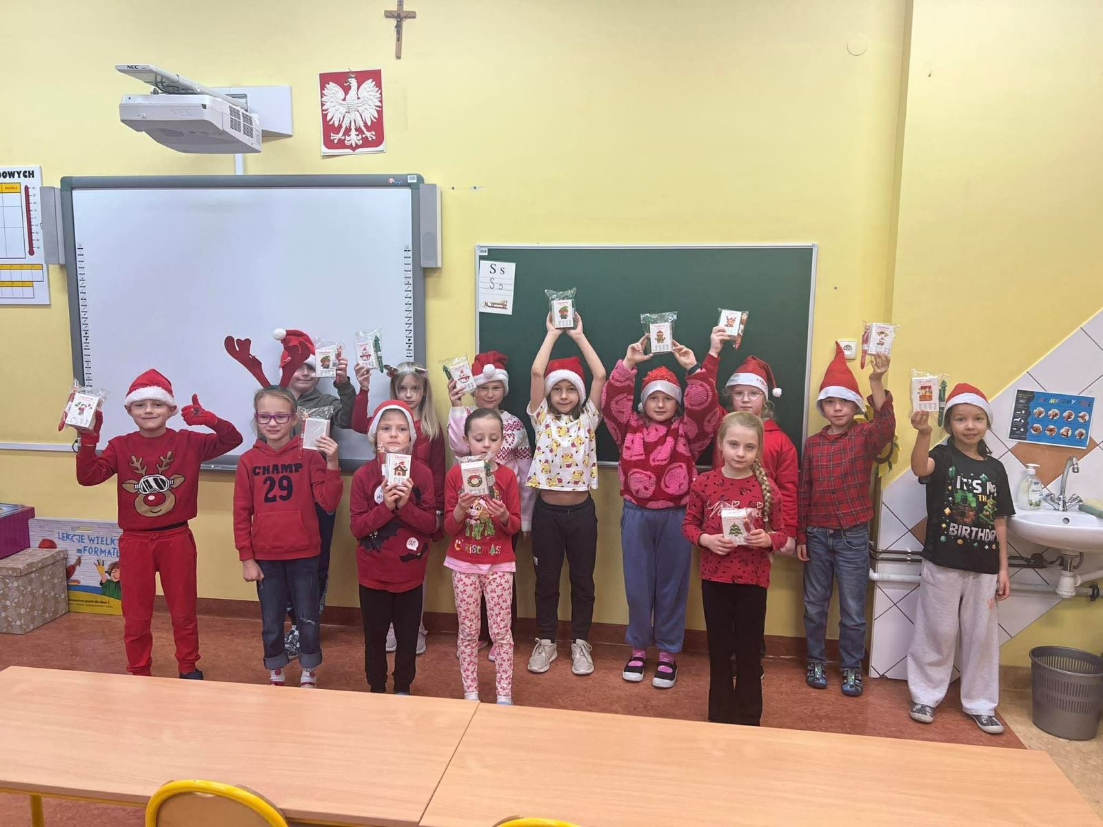 Szósty grudnia to data wyjątkowa i długo wyczekiwana zarówno przez dzieci, jak i dorosłych. Mikołajki na stałe wpisały się w kalendarz, dlatego także w tym roku nie zabrakło wspólnej zabawy, uśmiechów i świątecznej atmosfery. W klasach 1–3 uczniowie wzięli udział w integracyjnym tworzeniu najdłuższego świątecznego łańcucha, który później ozdobił korytarz szkoły, wprowadzając wszystkich w bożonarodzeniowy nastrój. Tego dnia szkolne sale i korytarze mieniły się czerwienią, bielą i złotem — uczniowie przyszli ubrani w stroje z akcentem mikołajkowym, co dodatkowo podkreśliło wyjątkowy charakter święta. Nie zabrakło również najważniejszego gościa – Świętego Mikołaja, który wraz z Paniami Mikołajowymi z Rady Rodziców odwiedzał uczniów i obdarowywał ich słodkimi upominkami. Wszędzie słychać było śmiech, radosne okrzyki i dźwięki świątecznej muzyki, przy której odbywały się wspólne zabawy. To był dzień pełen uśmiechu, integracji i wspólnego przeżywania wyjątkowego czasu, który z pewnością na długo pozostanie w pamięci naszych uczniów.