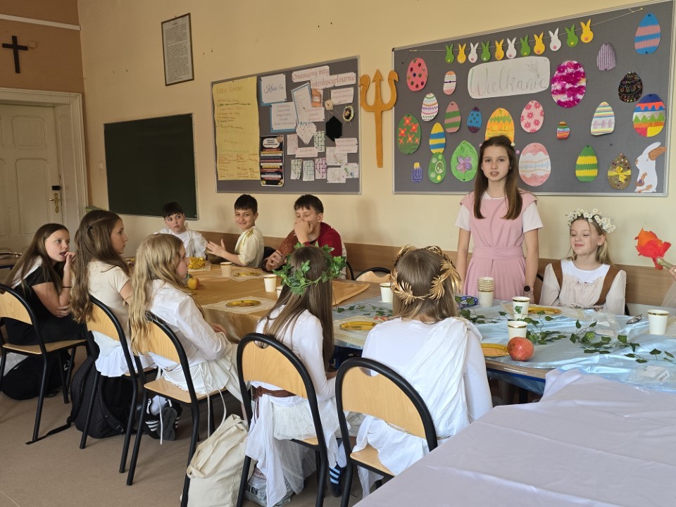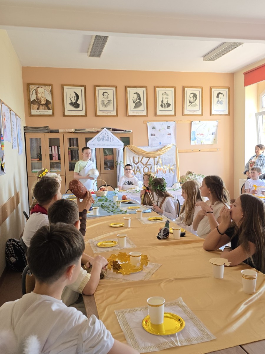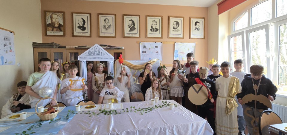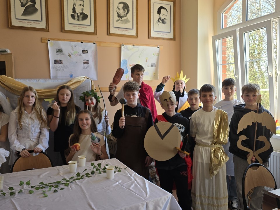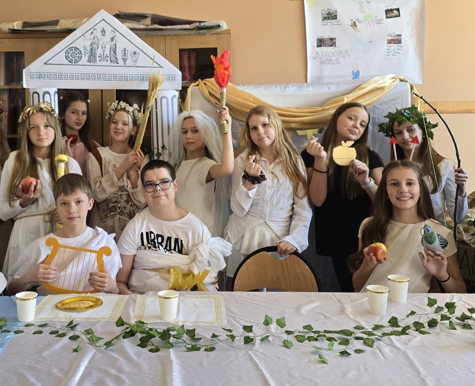 Podsumowaniem projektu mitologicznego była także „Uczta bogów na Olimpie”, podczas której każdy uczeń wcielił się w boga, herosa lub bohatera mitologicznego. Przygotowanie stroju, atrybutu i krótkiej przemowy wymagało sporo czasu i pracy, ale wszyscy doskonale się spisali. Na koniec przyszedł czas na zasłużony poczęstunek.