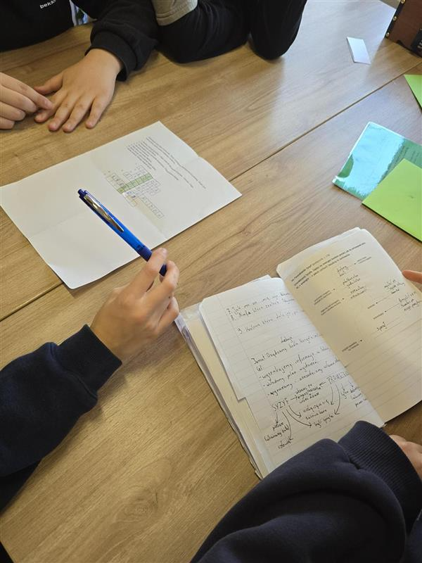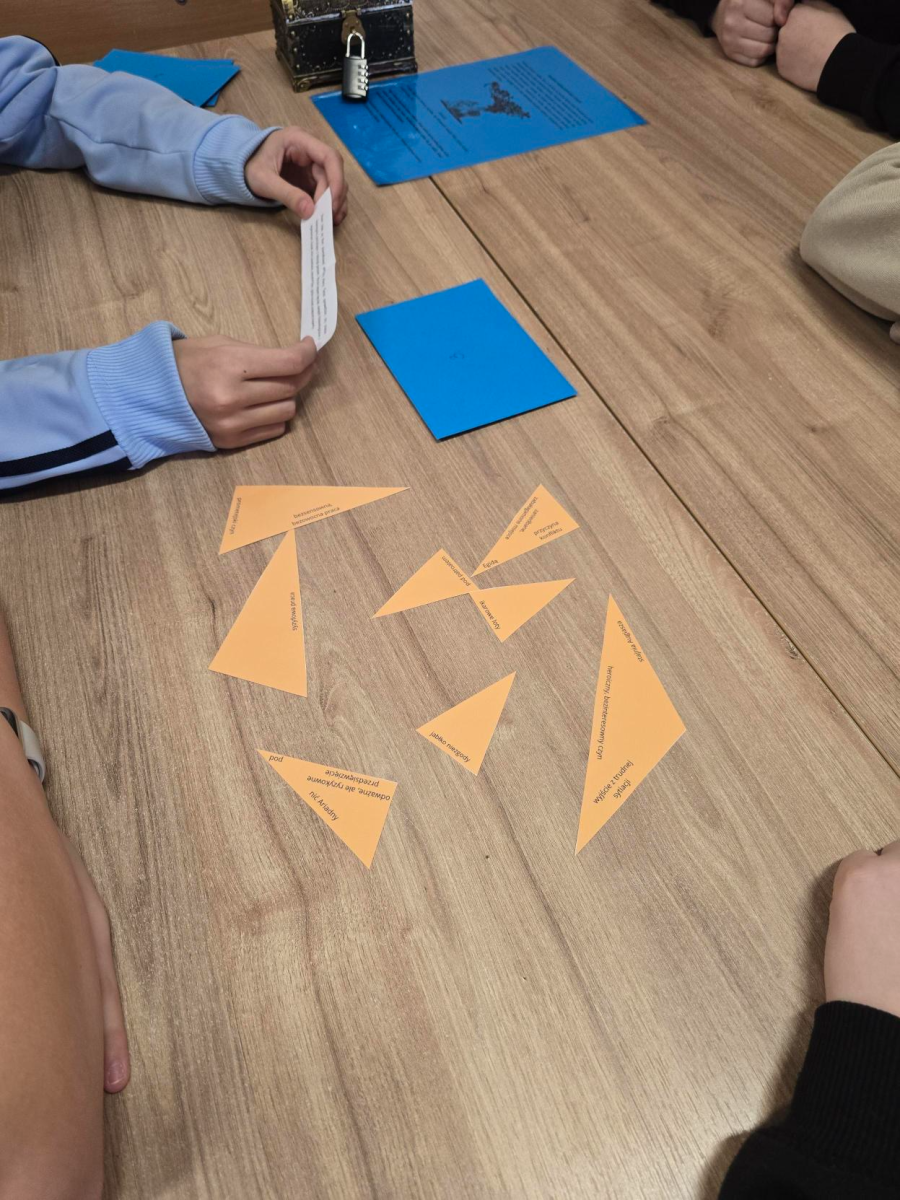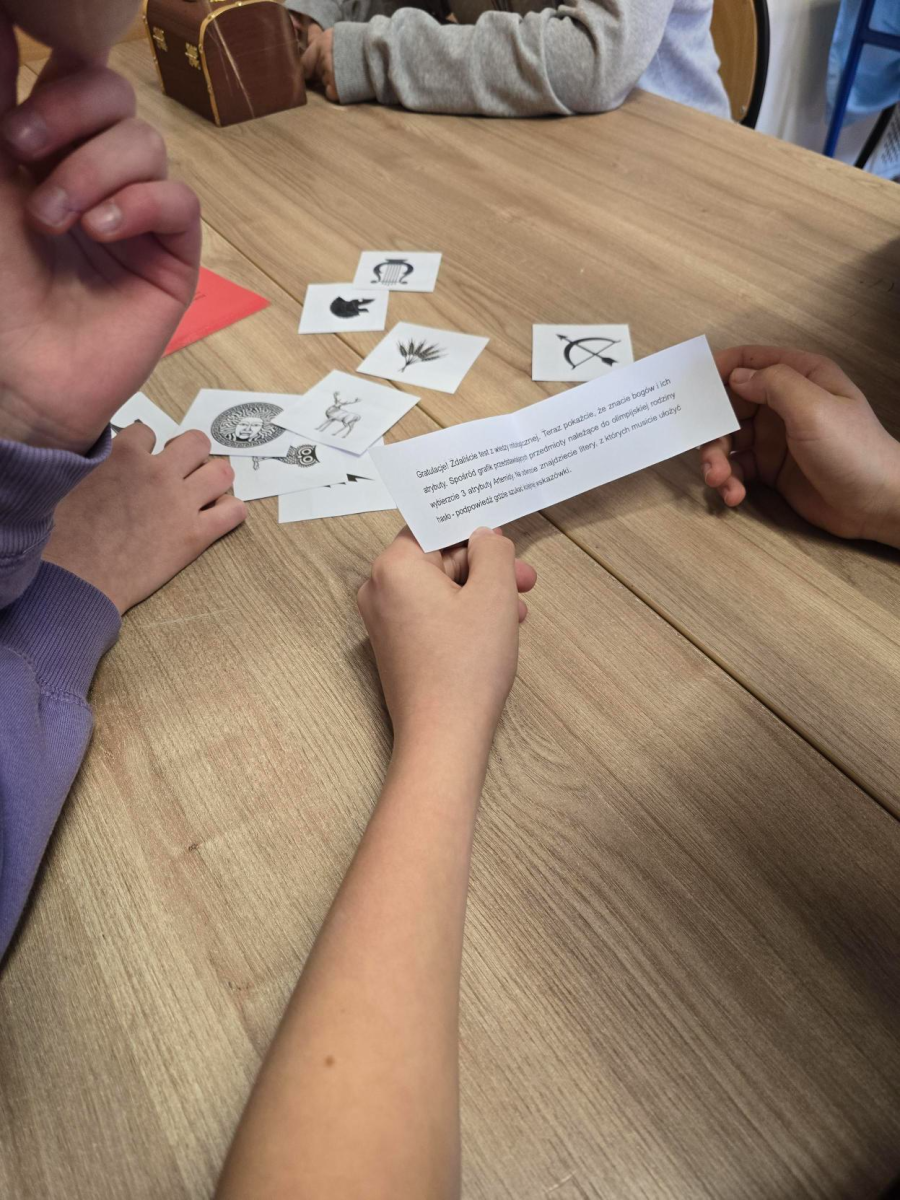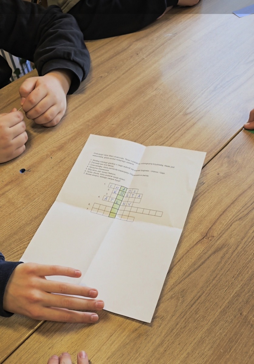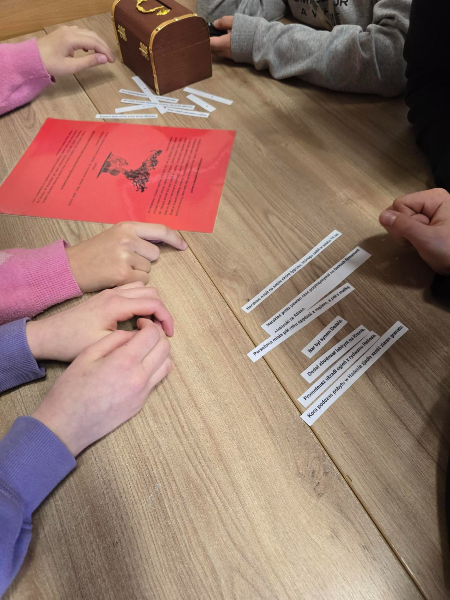 Uczniowie klasy 5a wraz z nauczycielką języka polskiego Justyną Pawlak w kreatywny sposób zakończyli cykl lekcji poświęcony mitologii. Zamiast standardowego sprawdzianu odbył się klasowy escape room, mający na celu powtórzenie i utrwalenie treści poznanych mitów. Uczniowie, pracując w grupach, zmierzyli się z zadaniami, zagadkami i łamigłówkami. Dodatkowym utrudnieniem była konieczność odszukania zadań ukrytych w sali. Nietypowa lekcja języka polskiego nie tylko pozwoliła utrwalić zdobytą wiedzę, ale także była okazją do ćwiczenia umiejętności krytycznego myślenia oraz współpracy. Nagrodą za aktywną pracę był słodki upominek, do którego uczniowie dostali się dzięki rozwiązaniu zagadki logicznej i rozszyfrowaniu specjalnego kodu.