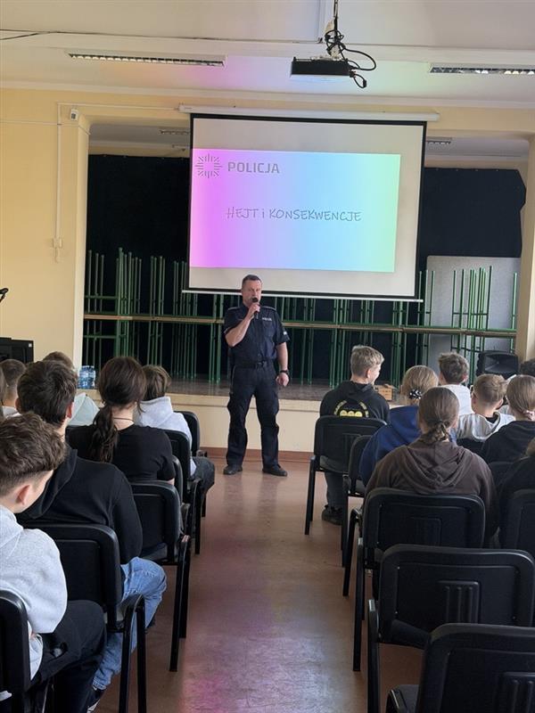 W dniu 15.04.2026r. w odbyło się spotkanie profilaktyczne dla uczniów klas VII–VIII z przedstawicielami Prewencji Policji w Poznaniu. Tematyka spotkania obejmowała zagadnienia związane z przeciwdziałaniem hejtowi, niewłaściwym zachowaniom w środowisku szkolnym oraz w przestrzeni internetowej, a także konsekwencjami prawnymi podejmowania takich działań przez osoby nieletnie. W trakcie spotkania funkcjonariusze Policji przedstawili w szczególności:
