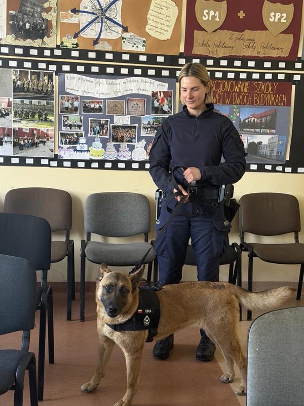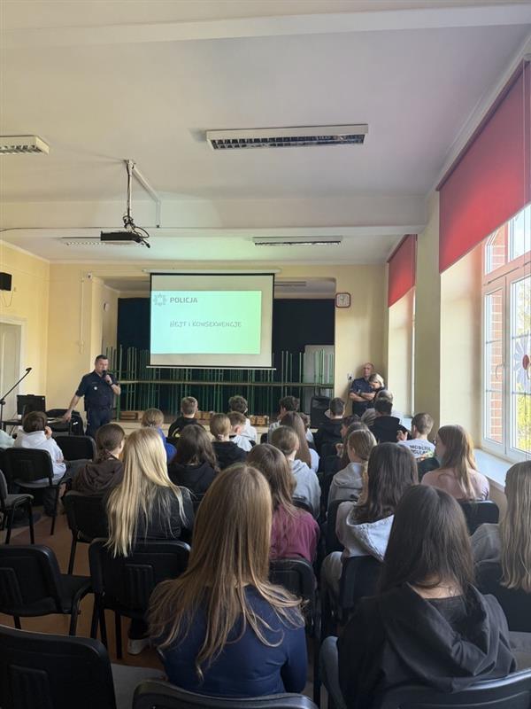 Ponadto zwrócono uwagę na negatywne skutki psychologiczne doświadczania hejtu oraz podkreślono znaczenie odpowiedzialnego i świadomego korzystania z mediów społecznościowych. W trakcie spotkania przeprowadzono również działania profilaktyczne z udziałem psa służbowego wyszkolonego do wykrywania środków odurzających, co miało na celu zwiększenie bezpieczeństwa uczniów oraz podniesienie świadomości w zakresie zagrożeń związanych z narkotykami. Spotkanie miało charakter profilaktyczno-edukacyjny i było elementem działań szkoły w zakresie zapewnienia bezpieczeństwa uczniów. Uczniowie aktywnie uczestniczyli w spotkaniu, zadawali pytania oraz wykazywali zainteresowanie poruszaną tematyką. Celem przeprowadzonego spotkania było zwiększenie świadomości prawnej uczniów, kształtowanie postaw opartych na szacunku wobec innych osób oraz zapobieganie zachowaniom ryzykownym.