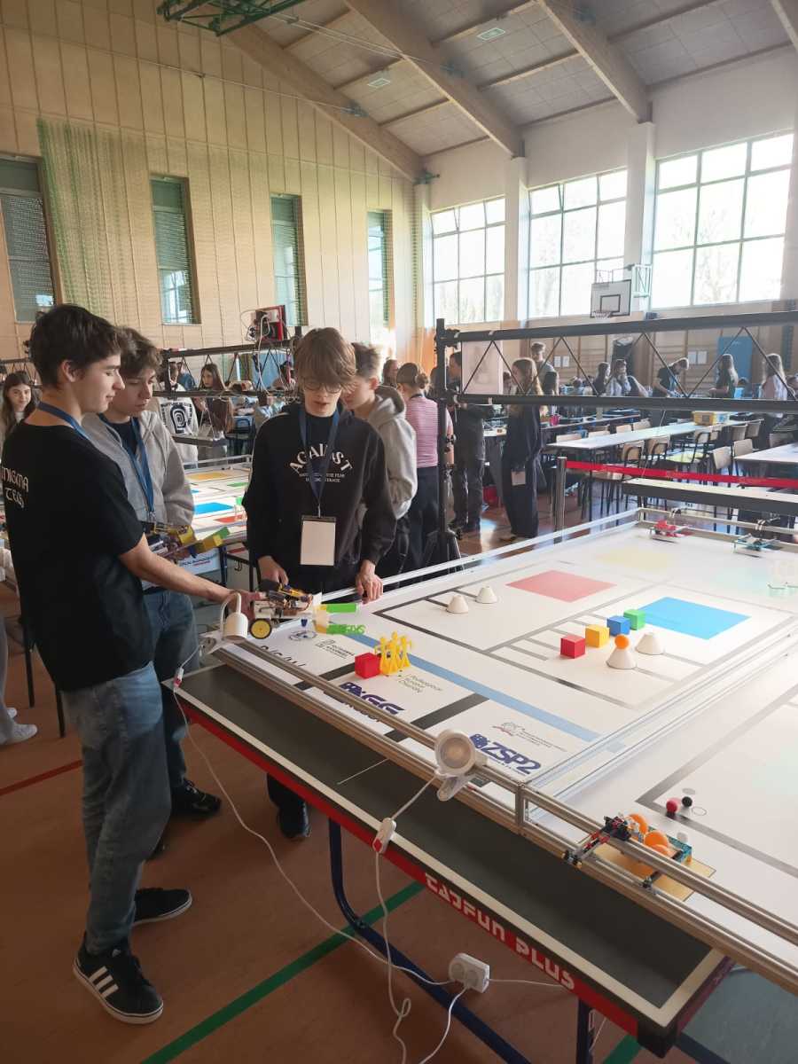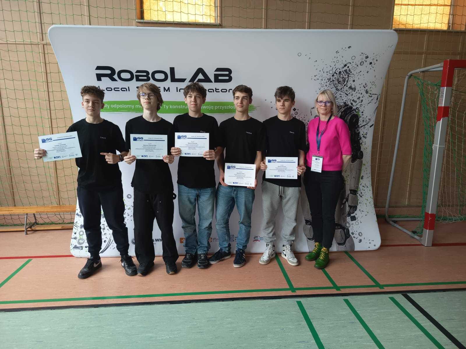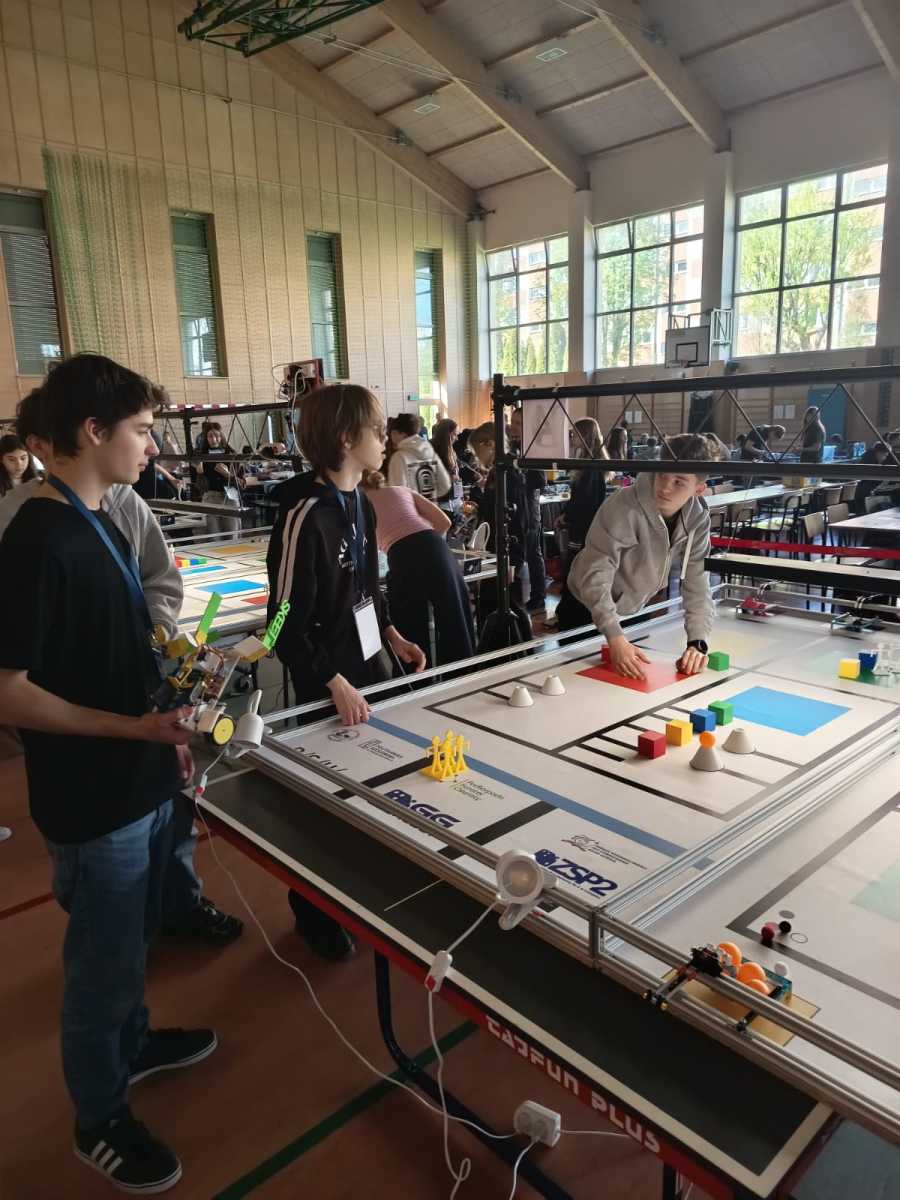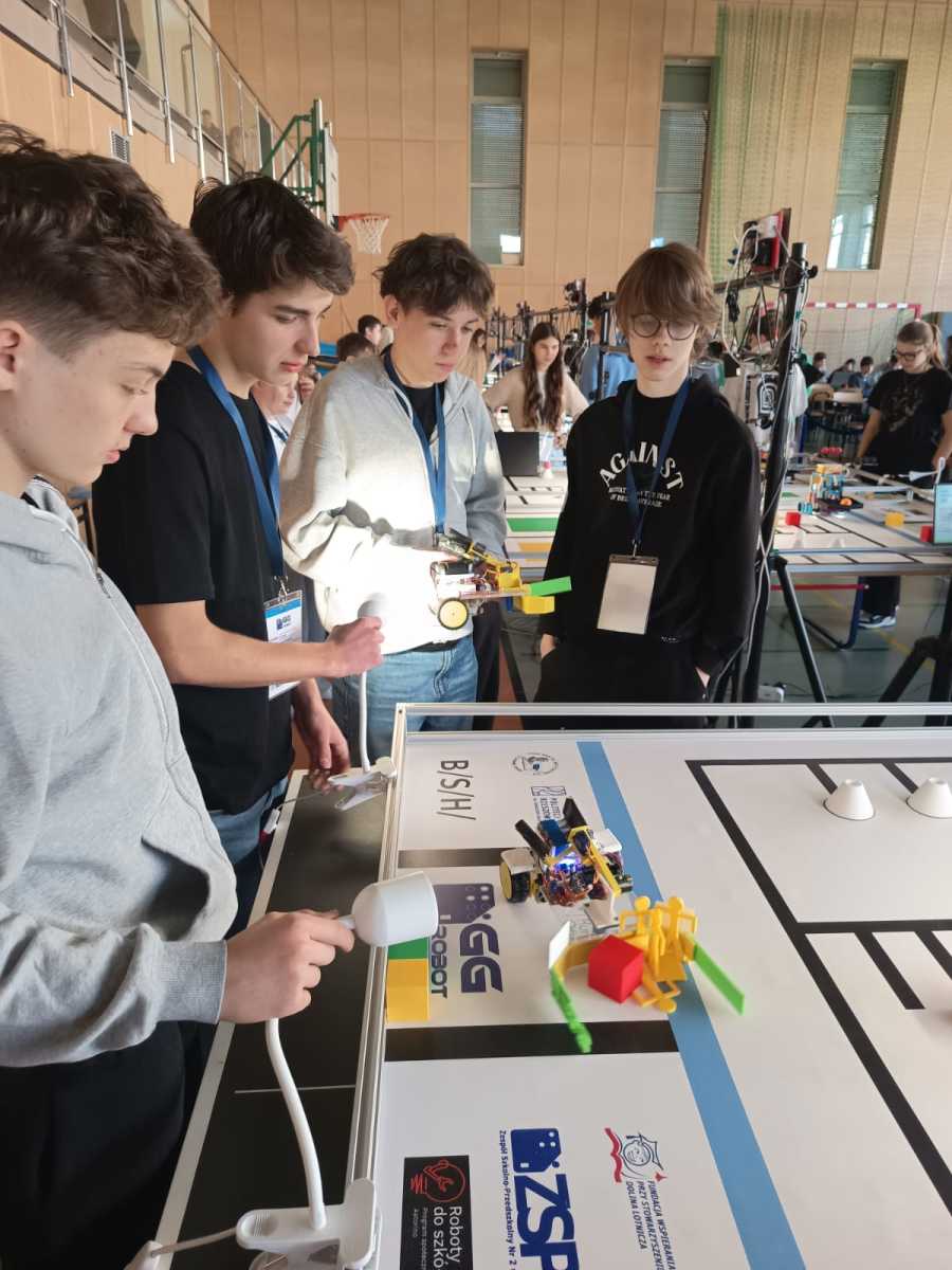 Konkurs „GG Robot” to prestiżowy turniej organizowany przez Podkarpackiego Kuratora Oświaty, którego celem jest rozwijanie zainteresowań uczniów naukami ścisłymi oraz przygotowanie ich do dalszego kształcenia technicznego i politechnicznego. Zawody odbyły się w Hali Sportowej Zespołu Szkolno-Przedszkolnego w Leżajsku. W rywalizacji wzięło udział 80 drużyn z całej Polski. Uczestnicy, pracując zespołowo, realizowali kolejne etapy konkursu – od przygotowania dokumentacji projektowej, obejmującej koncepcję robota i schemat jego działania, po samodzielną budowę urządzenia. Podczas zmagań uczniowie wykorzystywali wiedzę z zakresu nauk ścisłych, technologii, inżynierii i matematyki, a także rozwijali kompetencje językowe i umiejętność pracy zespołowej. Ważnym elementem była również prezentacja projektu przed komisją konkursową. Najbardziej emocjonującą częścią konkursu były walki robotów. Skonstruowane i zaprogramowane przez uczniów maszyny działały autonomicznie, wykorzystując czujniki do analizy otoczenia i podejmowania decyzji. Roboty reagowały m.in. na światło, odległość czy kolor, wykonując zadania na planszy konkursowej. Jesteśmy niezwykle dumni, że w naszej szkole uczą się tak zdolni, ambitni i zaangażowani młodzi ludzie, którzy z powodzeniem reprezentują nas na arenie ogólnopolskiej. Szczególne wyrazy wdzięczności kierujemy do Rodziców naszych uczniów. Dziękujemy za nieocenione wsparcie, zaangażowanie, poświęcony czas oraz obecność na każdym etapie przygotowań i udziału w konkursie. To właśnie dzięki Państwa pomocy i motywacji młodzież może rozwijać swoje pasje i osiągać tak znaczące sukcesy.
