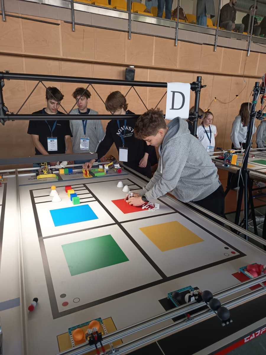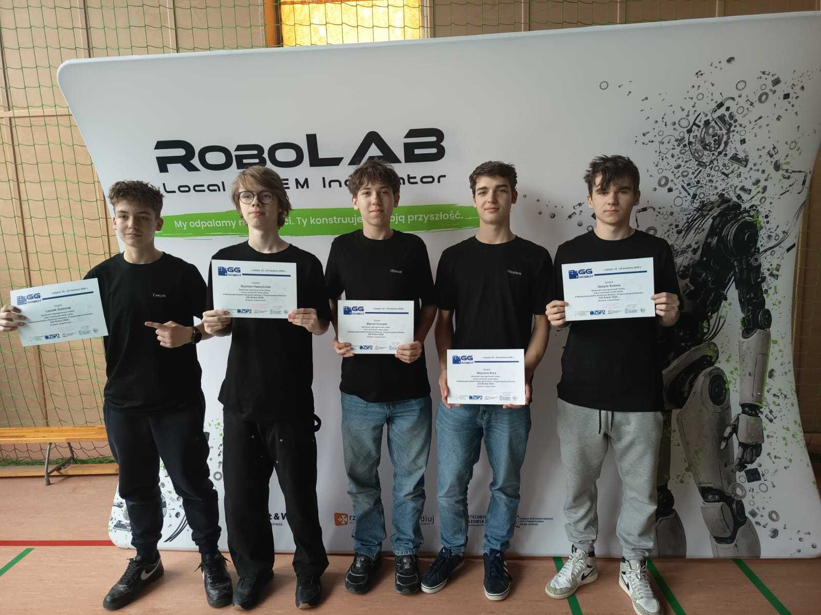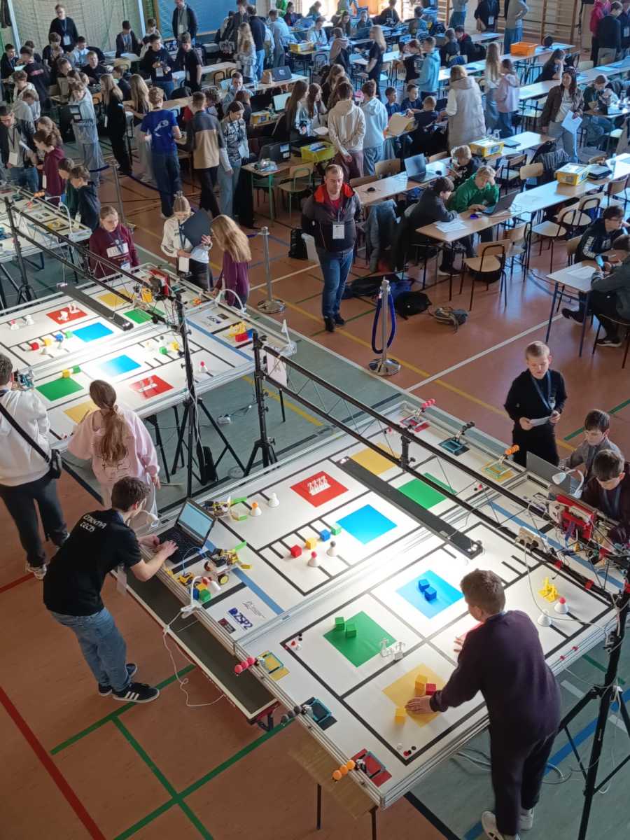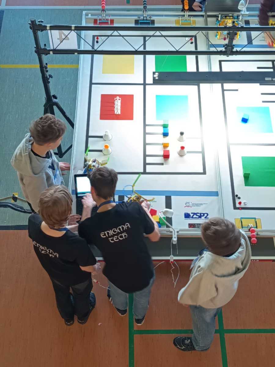 Konkurs „GG Robot” to prestiżowy turniej organizowany przez Podkarpackiego Kuratora Oświaty, którego celem jest rozwijanie zainteresowań uczniów naukami ścisłymi oraz przygotowanie ich do dalszego kształcenia technicznego i politechnicznego. Zawody odbyły się w Hali Sportowej Zespołu Szkolno-Przedszkolnego w Leżajsku. W rywalizacji wzięło udział 80 drużyn z całej Polski. Uczestnicy, pracując zespołowo, realizowali kolejne etapy konkursu – od przygotowania dokumentacji projektowej, obejmującej koncepcję robota i schemat jego działania, po samodzielną budowę urządzenia. Podczas zmagań uczniowie wykorzystywali wiedzę z zakresu nauk ścisłych, technologii, inżynierii i matematyki, a także rozwijali kompetencje językowe i umiejętność pracy zespołowej. Ważnym elementem była również prezentacja projektu przed komisją konkursową. Najbardziej emocjonującą częścią konkursu były walki robotów. Skonstruowane i zaprogramowane przez uczniów maszyny działały autonomicznie, wykorzystując czujniki do analizy otoczenia i podejmowania decyzji. Roboty reagowały m.in. na światło, odległość czy kolor, wykonując zadania na planszy konkursowej. Jesteśmy niezwykle dumni, że w naszej szkole uczą się tak zdolni, ambitni i zaangażowani młodzi ludzie, którzy z powodzeniem reprezentują nas na arenie ogólnopolskiej. Szczególne wyrazy wdzięczności kierujemy do Rodziców naszych uczniów. Dziękujemy za nieocenione wsparcie, zaangażowanie, poświęcony czas oraz obecność na każdym etapie przygotowań i udziału w konkursie. To właśnie dzięki Państwa pomocy i motywacji młodzież może rozwijać swoje pasje i osiągać tak znaczące sukcesy.