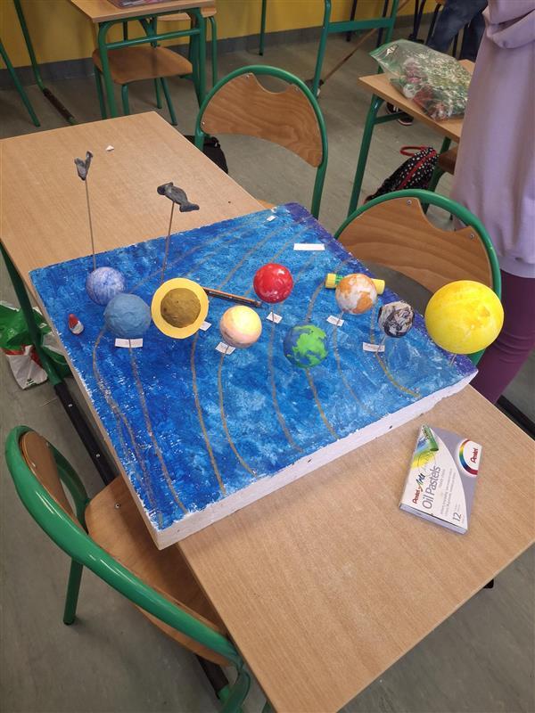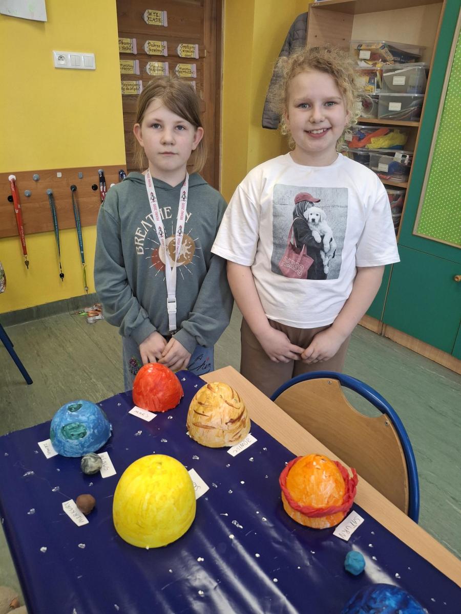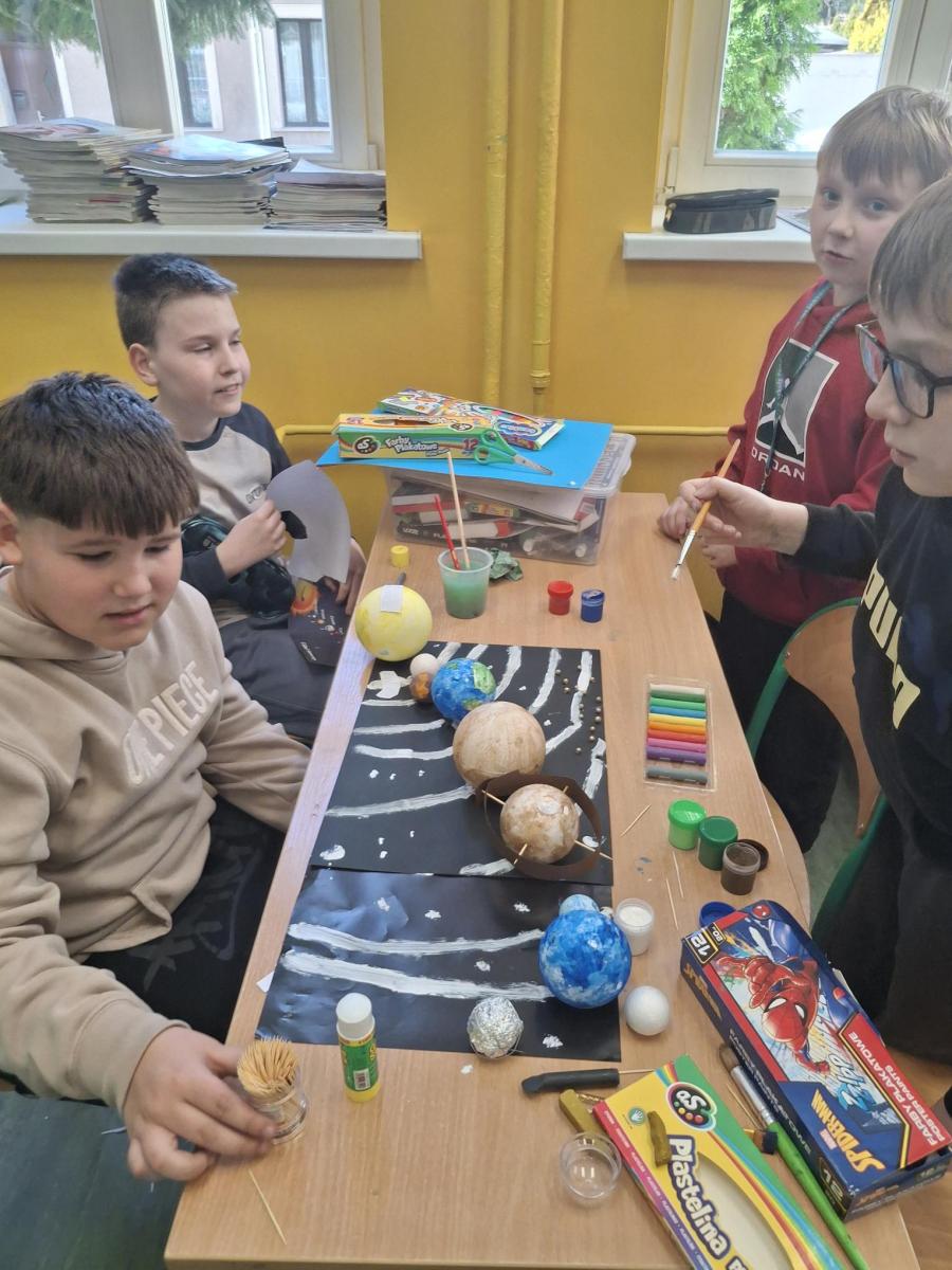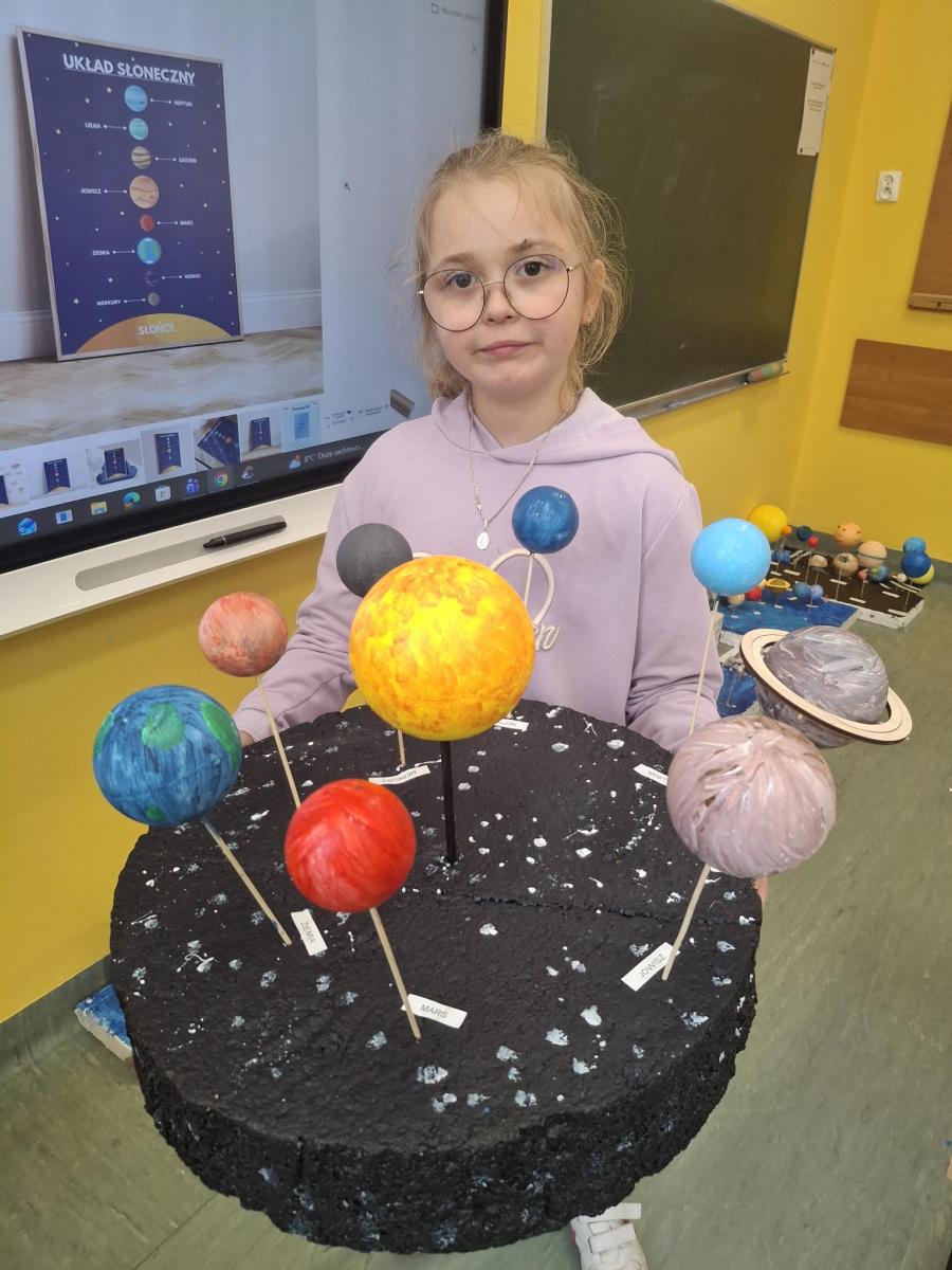 Uczniowie klasy 3b z ogromnym zaangażowaniem poznawali tajemnice planet Układu Słonecznego. Zajęcia miały nie tylko charakter teoretyczny – największą wartością była nauka poprzez działanie. Uczniowie, pracując w grupach, tworzyli makiety Układu Słonecznego, co pozwoliło im lepiej zrozumieć rozmieszczenie planet. Przygotowując się do wykonania pracy, zapamiętali również najważniejsze cechy każdej z planet. Wspólna praca sprzyjała wymianie pomysłów, współpracy i kreatywnemu podejściu do nauki. Każdy uczeń indywidualnie przygotował opis wybranej planety, dzieląc się ciekawostkami i zdobytymi informacjami. Dzięki temu uczniowie nie tylko poszerzyli swoją wiedzę, ale także rozwijali umiejętność samodzielnej pracy i prezentowania informacji. To były zajęcia pełne zaangażowania, radości i odkrywania świata, a przede wszystkim skutecznej nauki poprzez doświadczenie.