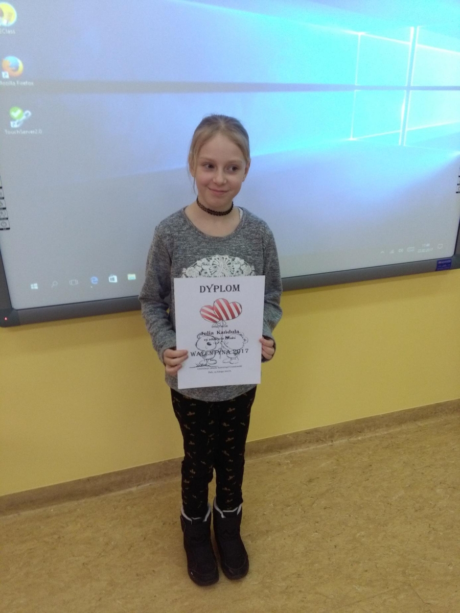 14 lutego 2017r. obchodziliśmy Dzień Zakochanych – Walentynki. Tego dnia w szkole królował kolor czerwony. Samorząd Uczniowski już przed feriami rozpoczął przygotowania do tego szczególnego dnia. Przygotowana została specjalna skrzynka, do której można było wrzucać walentynki dla swojego wybranka lub wybranki. Miłosne kartki zostały dostarczone w świąteczny dzień do klas przez szkolnych listonoszy. Wcześniej Samorząd Uczniowski przeliczył ilość otrzymanych walentynek w poszczególnych klasach i wyłonił osoby, które otrzymały ich najwięcej. Tytuł Walentyny 2017 otrzymała Julia Kańduła z klasy 3e, a tytuł Walentego 2017 otrzymali: Wiktor Wróblewski z klasy 3c, Kacper Szymaszyk z klasy 3b. Zwycięzcy otrzymali dyplomy.