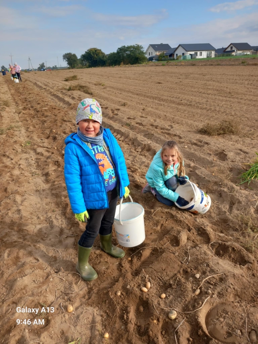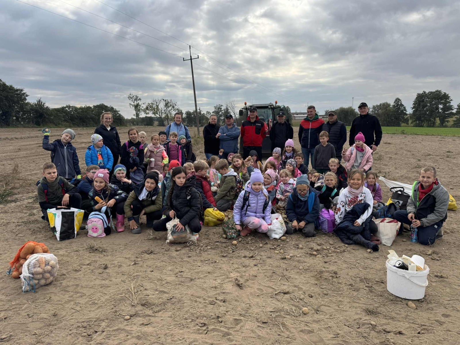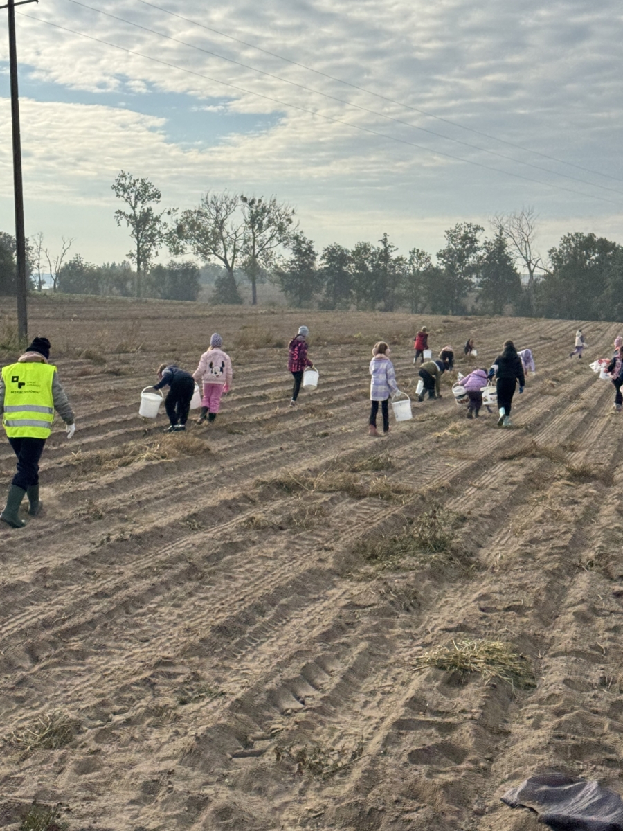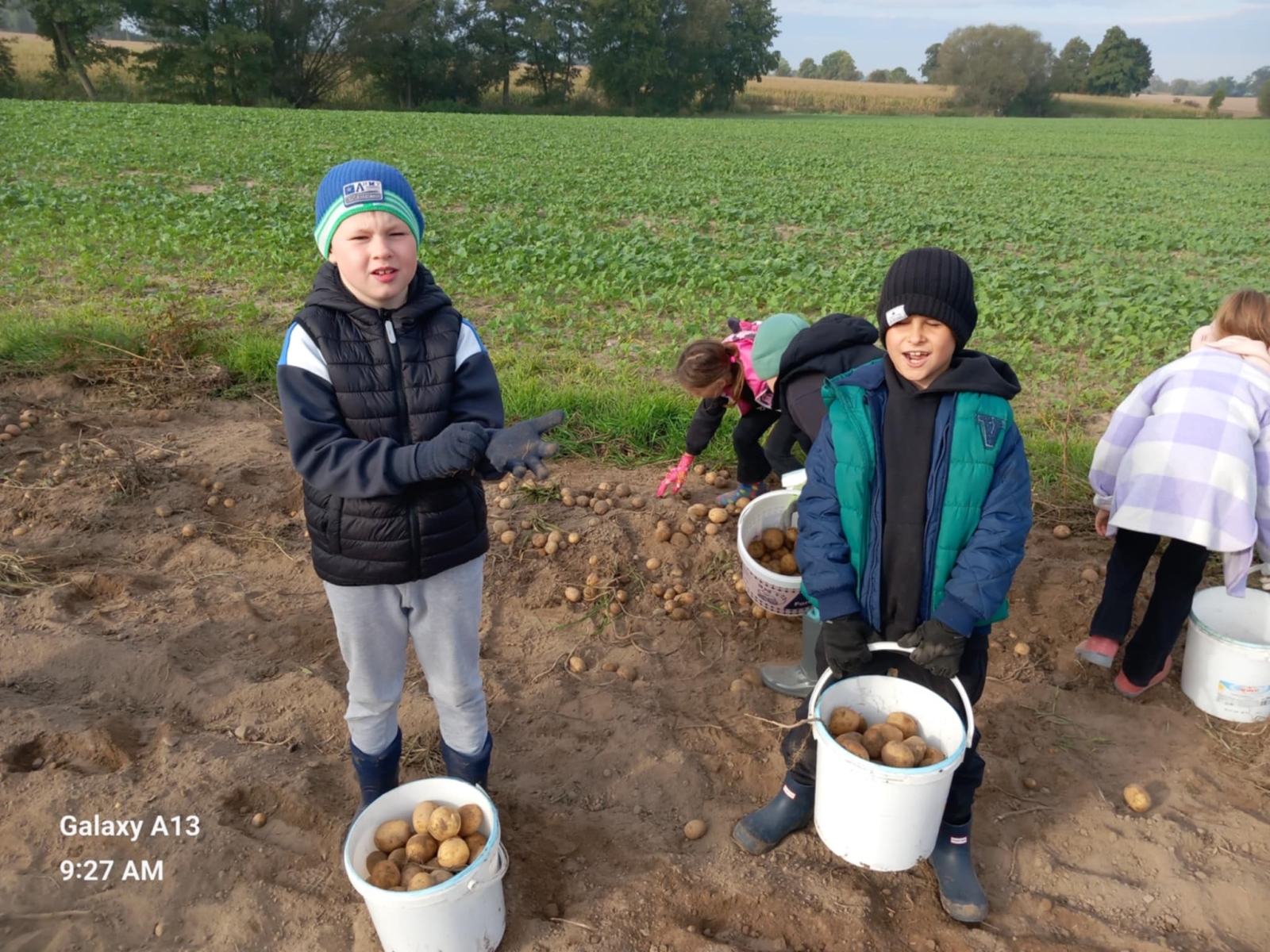 Uczniowie klas 2c i 2e mieli okazję dokładnie zaobserwować, jak wyglądają prace na polu oraz przekonać się, ile wysiłku wymaga zbieranie plonów. Dzieci uczestniczyły w wykopkach ziemniaków, ucząc się szacunku do pracy drugiego człowieka i zdobywając cenną wiedzę przyrodniczą. To wyjątkowe doświadczenie nie tylko połączyło naukę z praktyką, ale również pozwoliło uczniom docenić piękno polskiej wsi i radość wspólnej pracy.