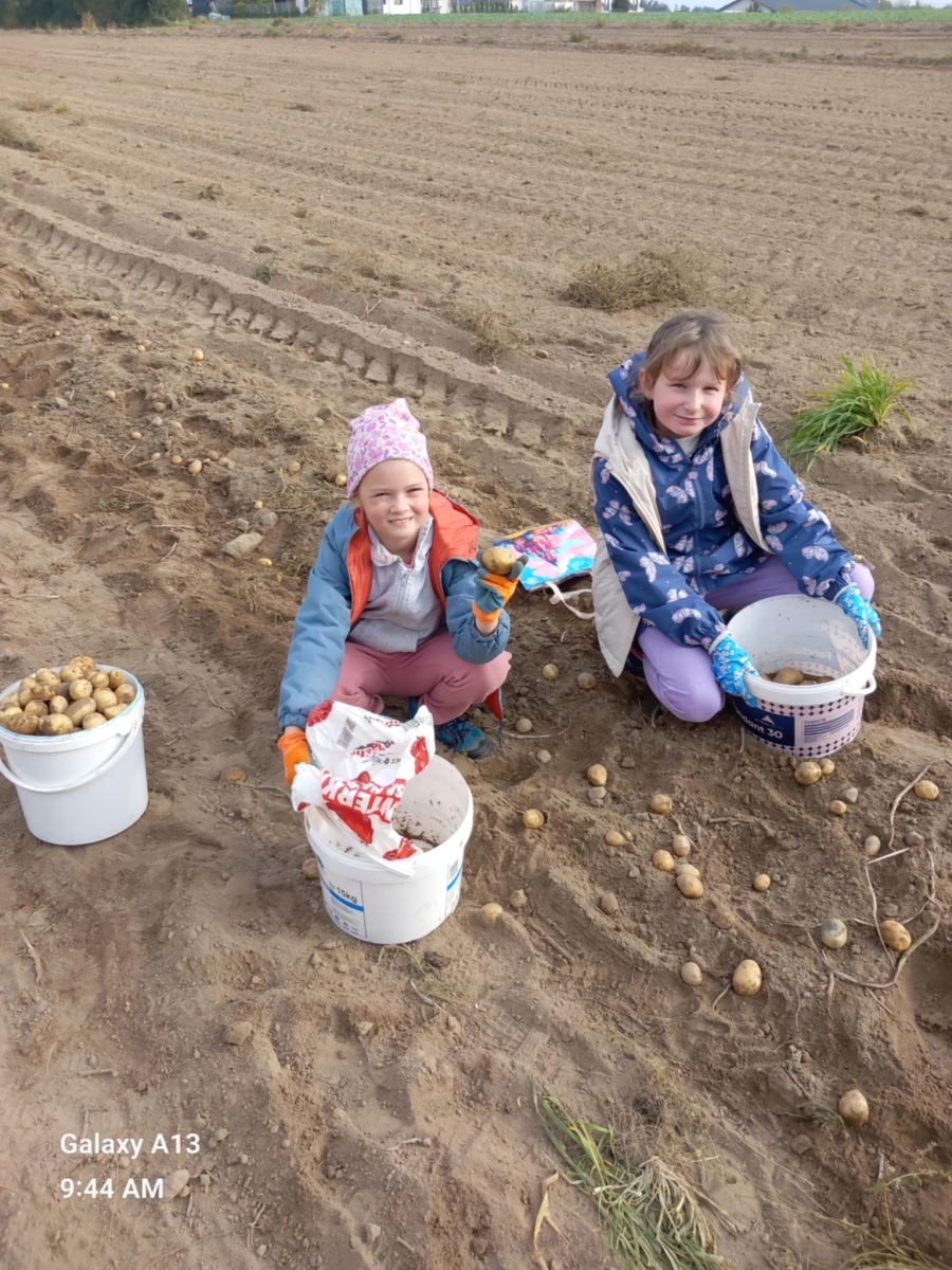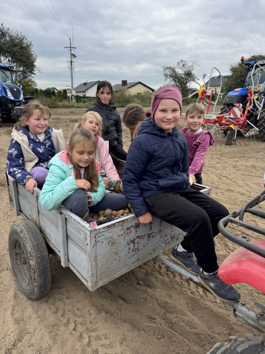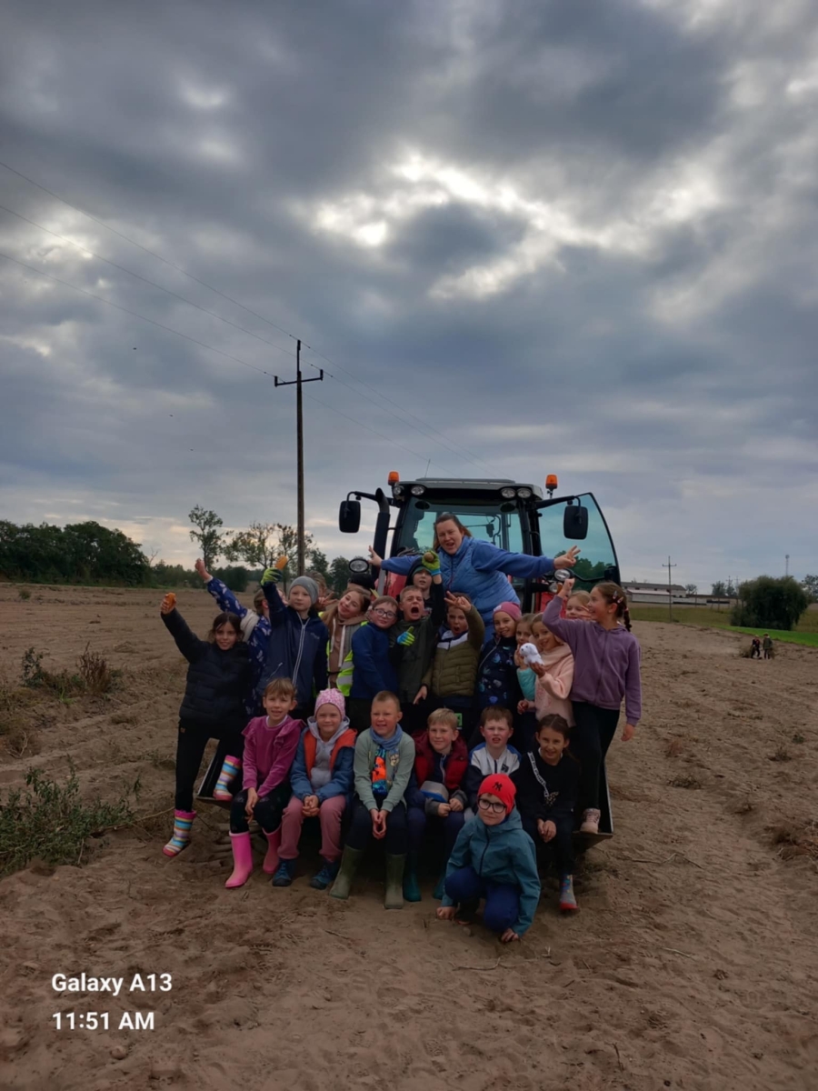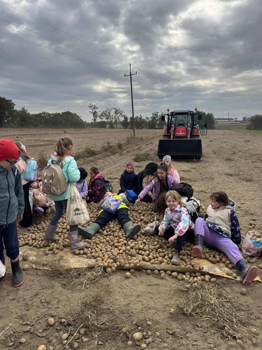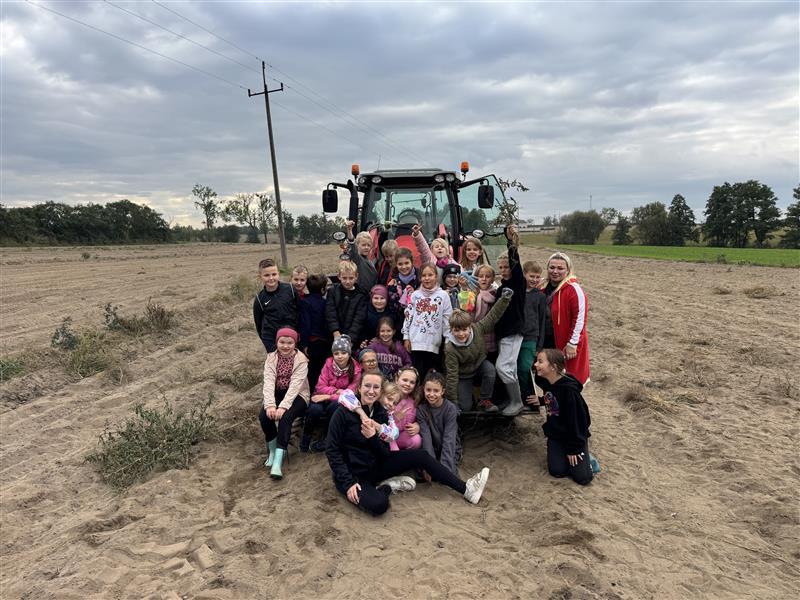 Uczniowie klas 2c i 2e mieli okazję dokładnie zaobserwować, jak wyglądają prace na polu oraz przekonać się, ile wysiłku wymaga zbieranie plonów. Dzieci uczestniczyły w wykopkach ziemniaków, ucząc się szacunku do pracy drugiego człowieka i zdobywając cenną wiedzę przyrodniczą. To wyjątkowe doświadczenie nie tylko połączyło naukę z praktyką, ale również pozwoliło uczniom docenić piękno polskiej wsi i radość wspólnej pracy.