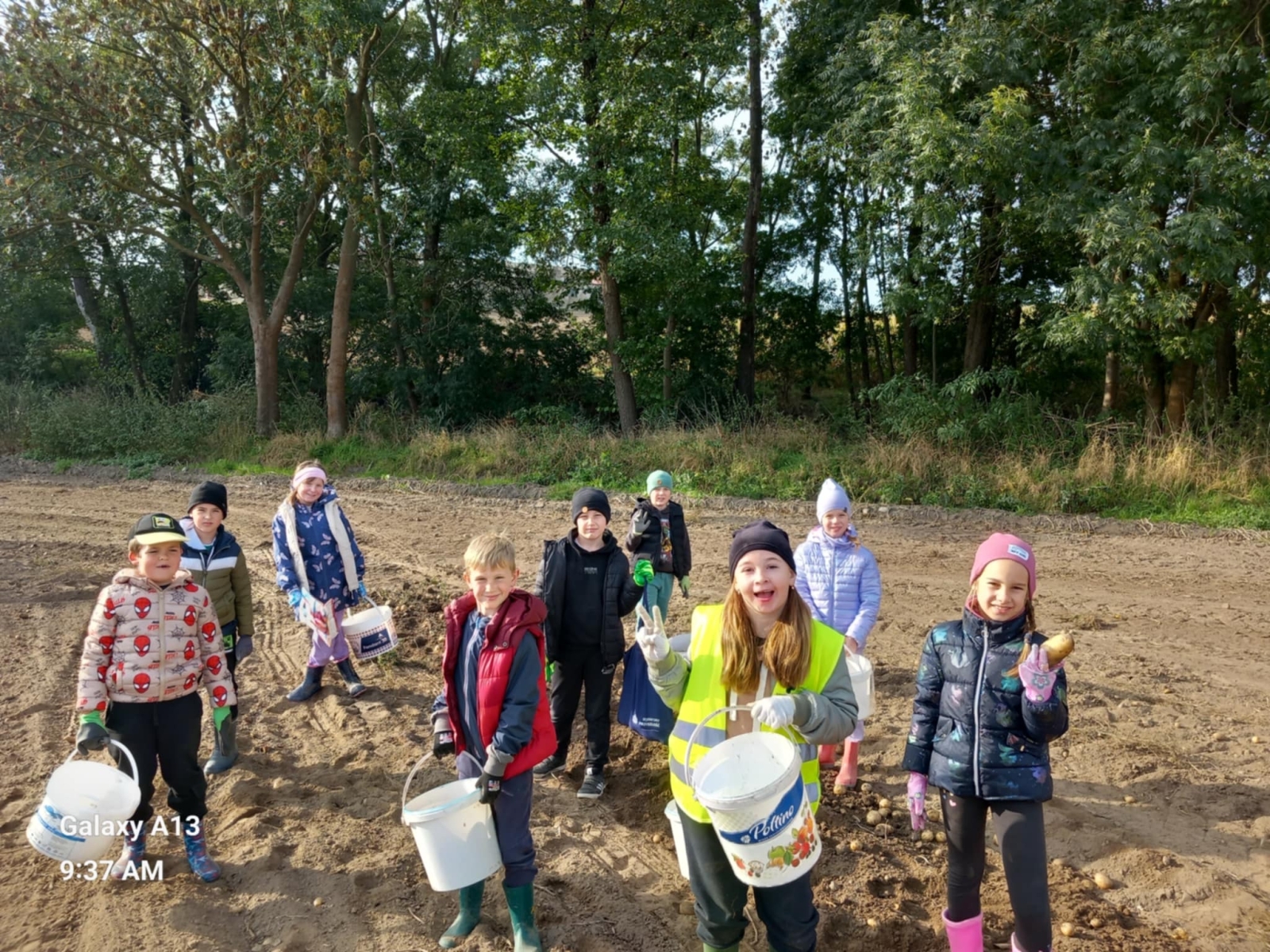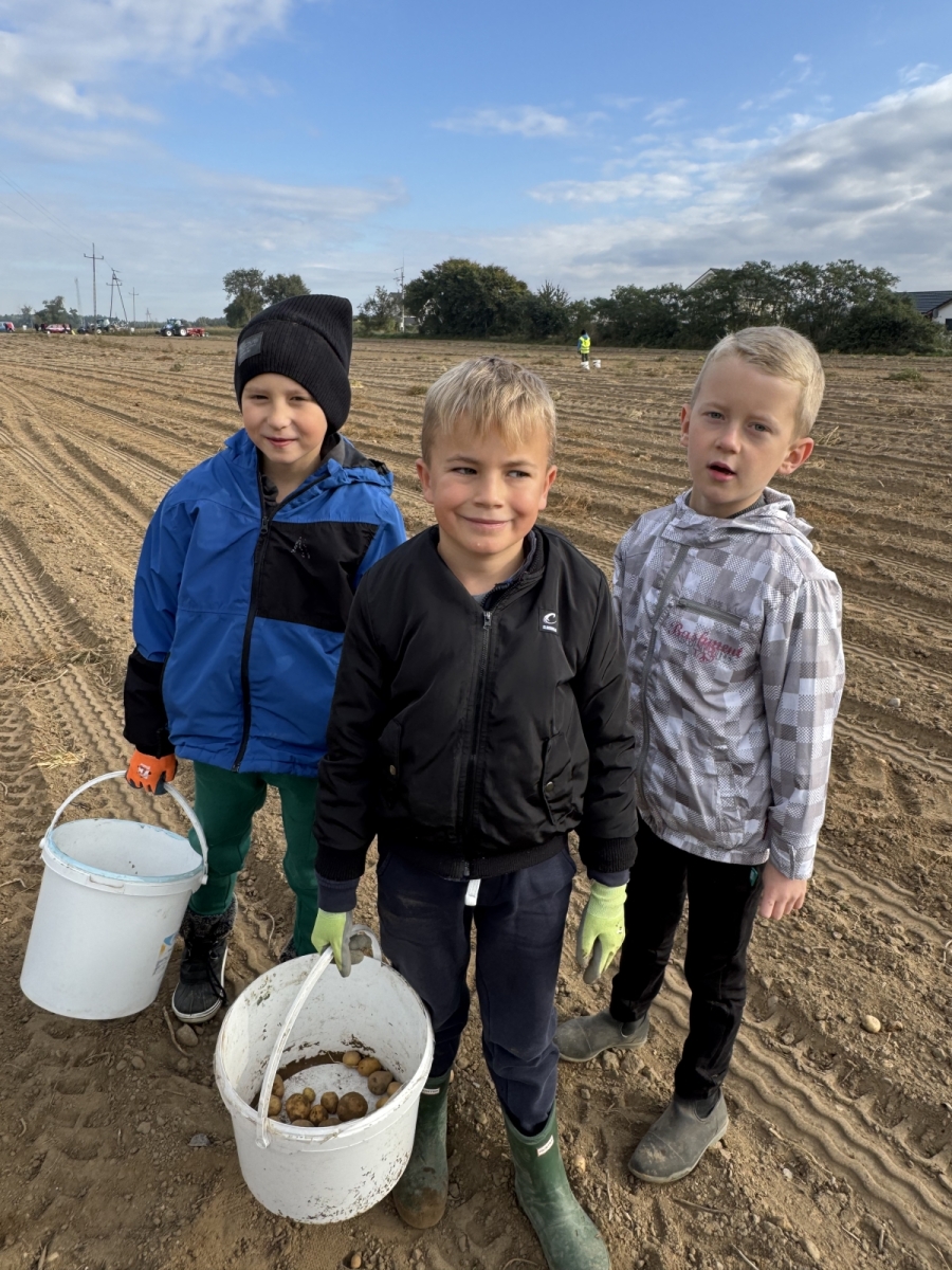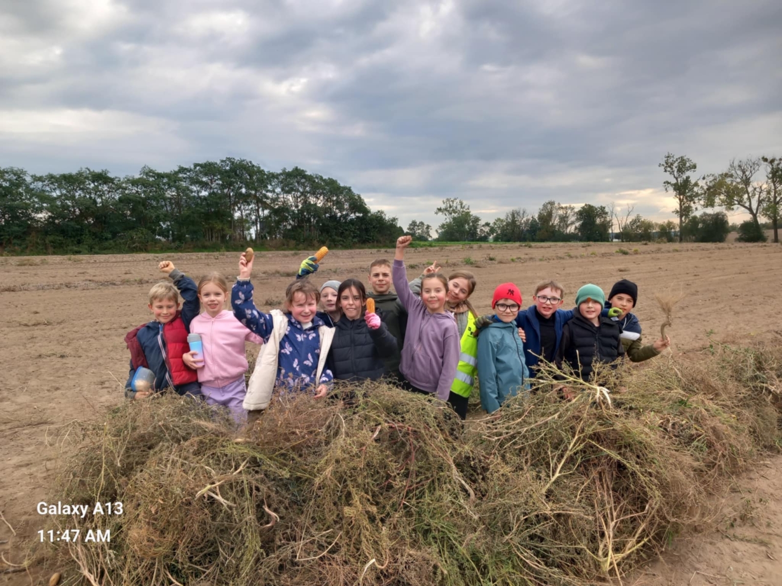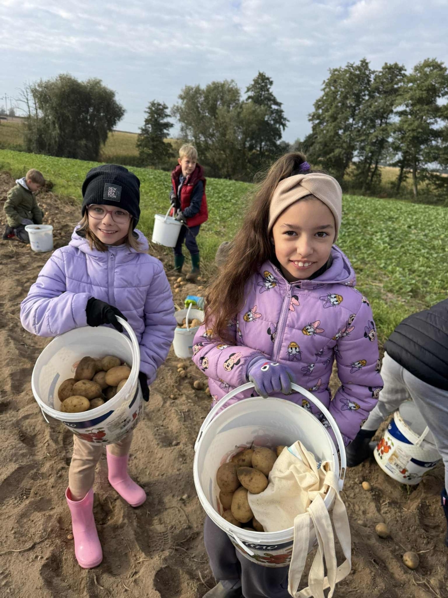 Uczniowie klas 2c i 2e mieli okazję dokładnie zaobserwować, jak wyglądają prace na polu oraz przekonać się, ile wysiłku wymaga zbieranie plonów. Dzieci uczestniczyły w wykopkach ziemniaków, ucząc się szacunku do pracy drugiego człowieka i zdobywając cenną wiedzę przyrodniczą. To wyjątkowe doświadczenie nie tylko połączyło naukę z praktyką, ale również pozwoliło uczniom docenić piękno polskiej wsi i radość wspólnej pracy.